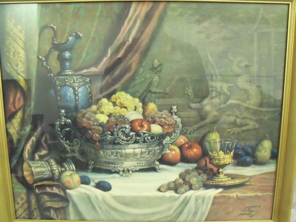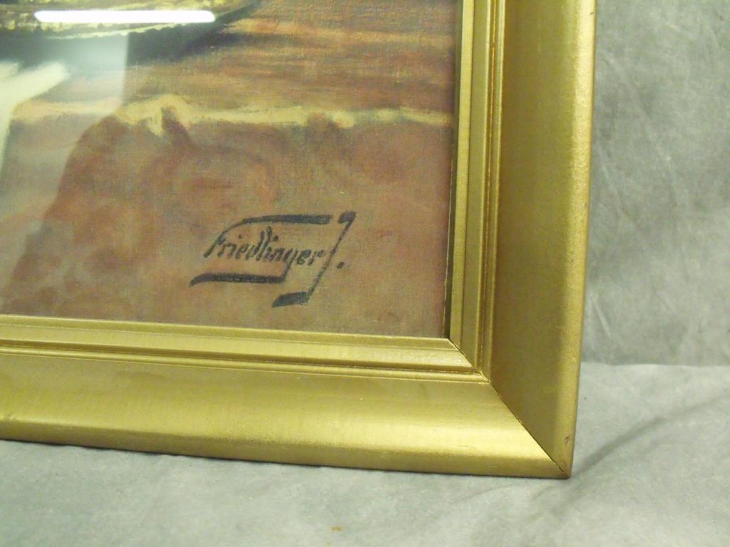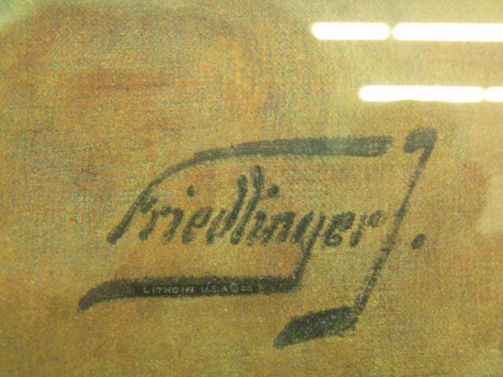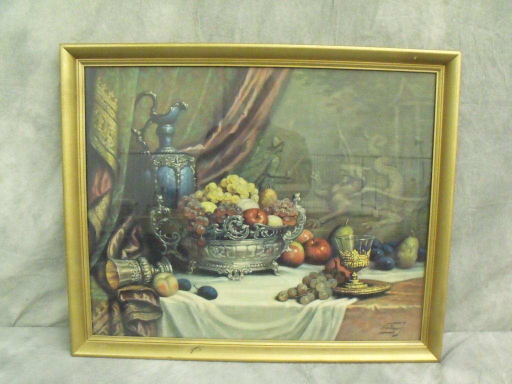Friedlinger collectible lithograph, depicting fruit, goblets, and pitcher in 17th century style. In vintage gold colored frame, has artist name in bottom right hand corner, also marked lithograph. 29"x24" lithograph size.