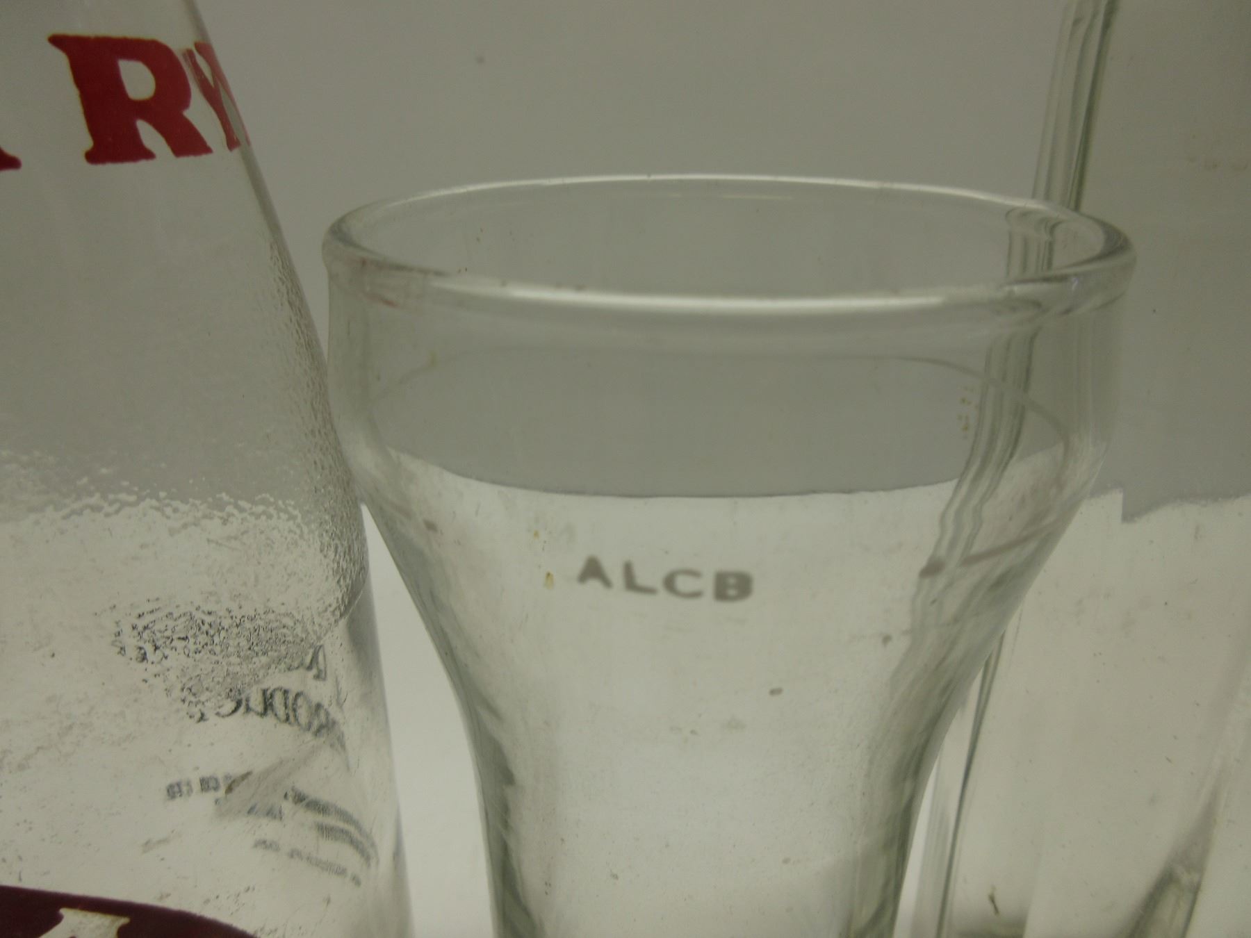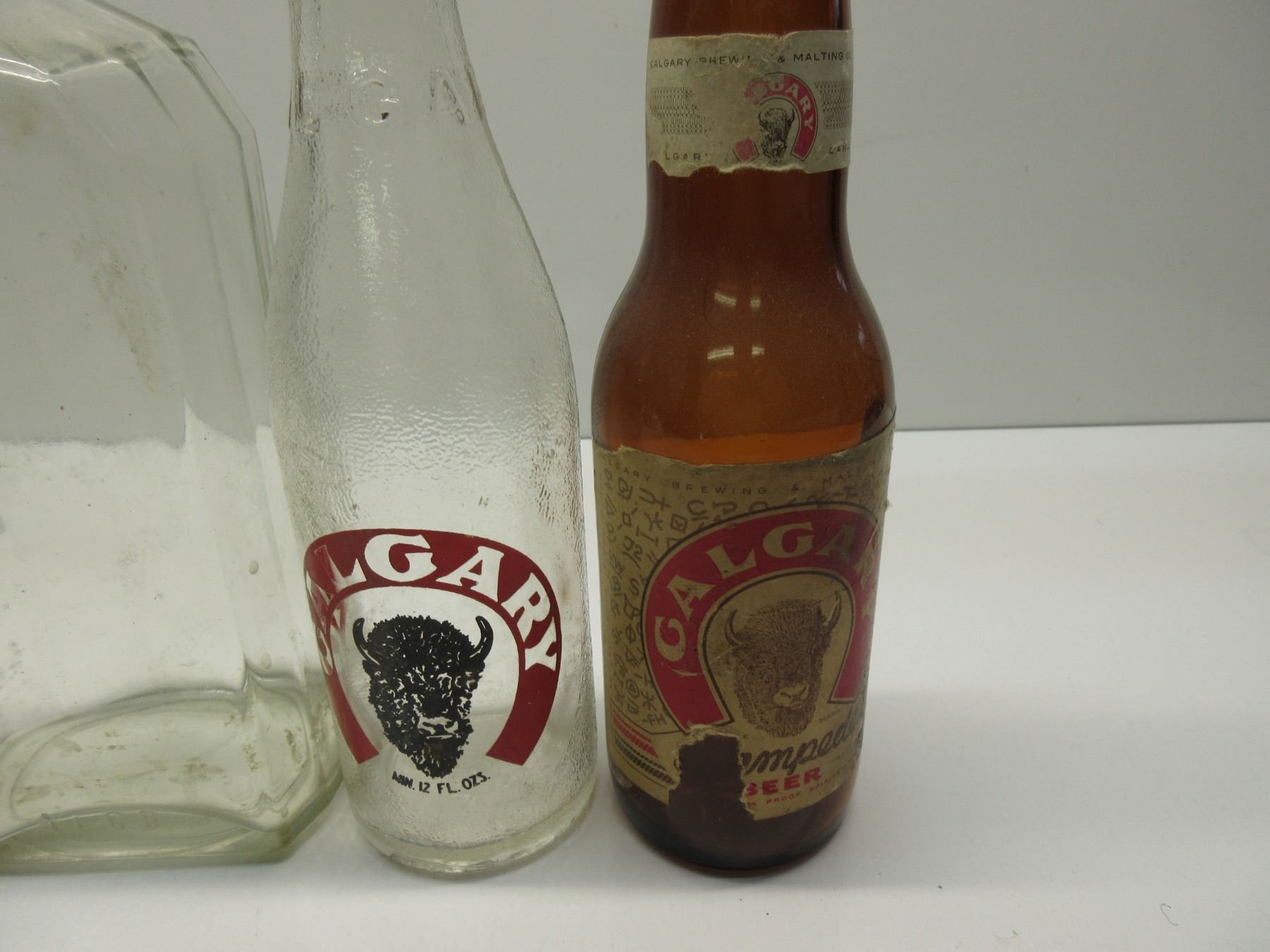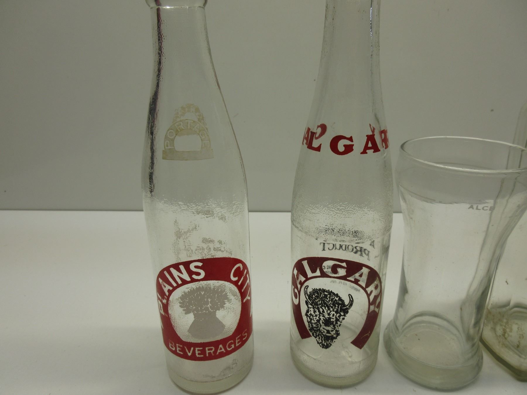 Collectible Glass & Bottles - ALCB glass & liquor bottle (has crack in top), brown bottle Calgary stampede, clear bottles Calgary 1 embossed 1 printed, and Plains City Beverages Manitoba
