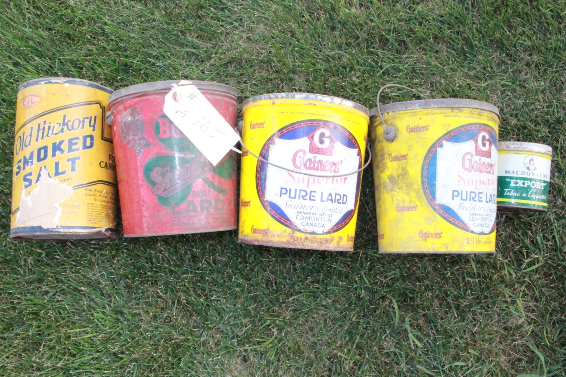 2 Gainers Lard - 10 lb.; Burns Pure Lard - 10 lb.; CIL Old Hickory Smoked Salt & a MacDonalds Tobacco tin