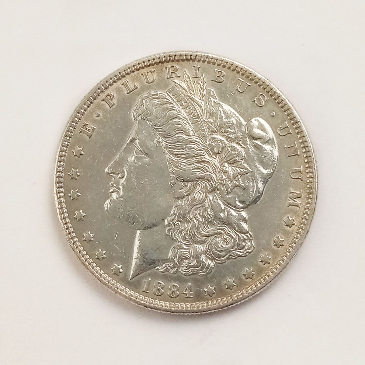 Collectible US 1884 MORGAN silver one $1 dollar coin. Our opinion is AU55