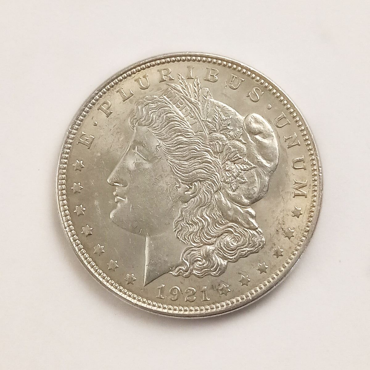 Collectible US 1921 MORGAN silver one $1 dollar coin. Our opinion is AU58