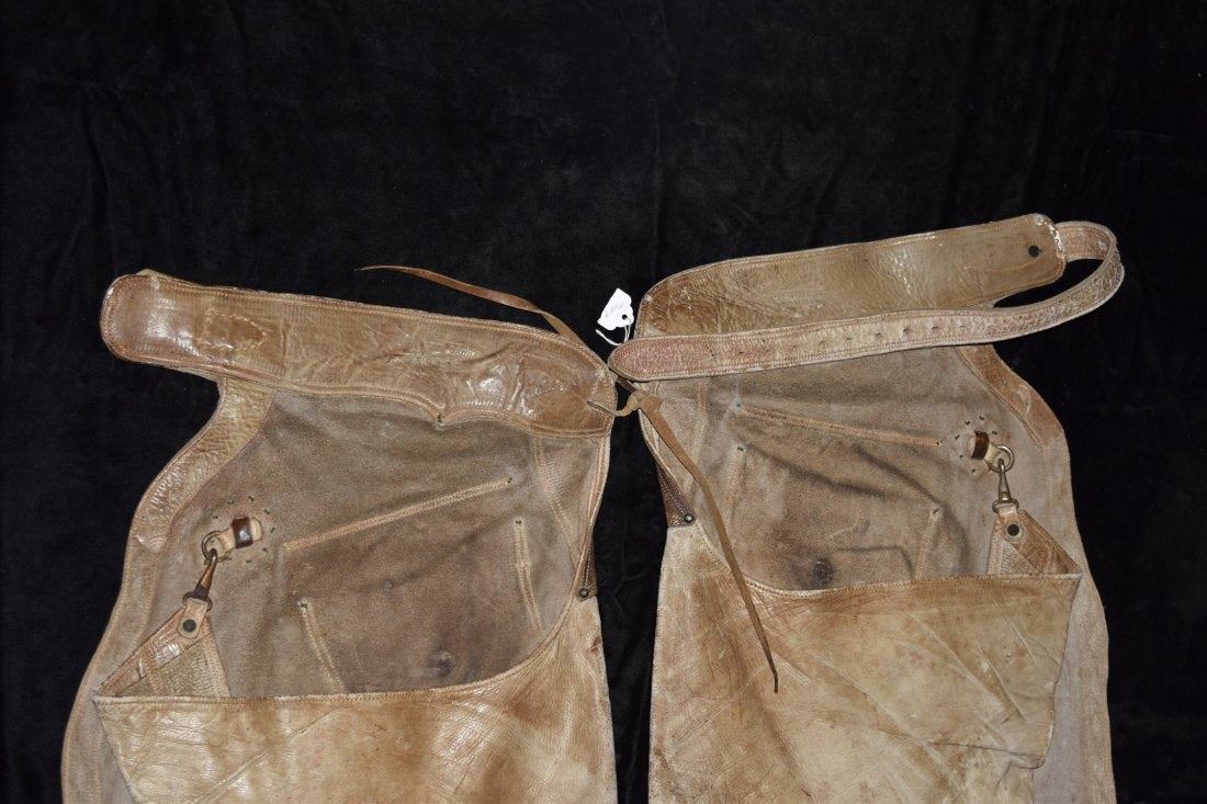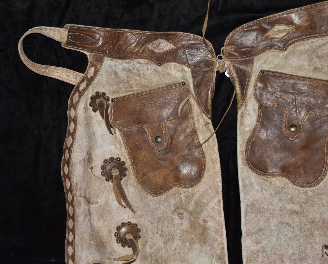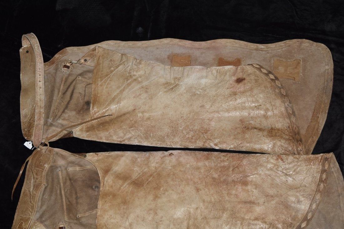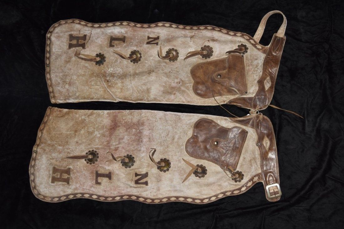 Highly Collectible Visalia Stock Cattle Company Western Monogram Chaps, From San Francisco. Double stamped with Visalia Logo, dated pre 1925. Features original hardware, great patina. Approximately 40" long
