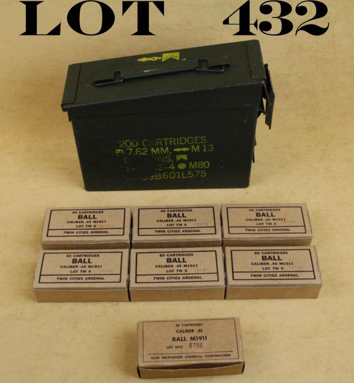 Collectible lot of 7 boxes of 50 cartridges .45 caliber ball M1911 ammo in tan colored boxes by Olin Mathieson Chemical Corporation and Twin Cities Arsenal, different Lot #s. Est.: $75-$150.