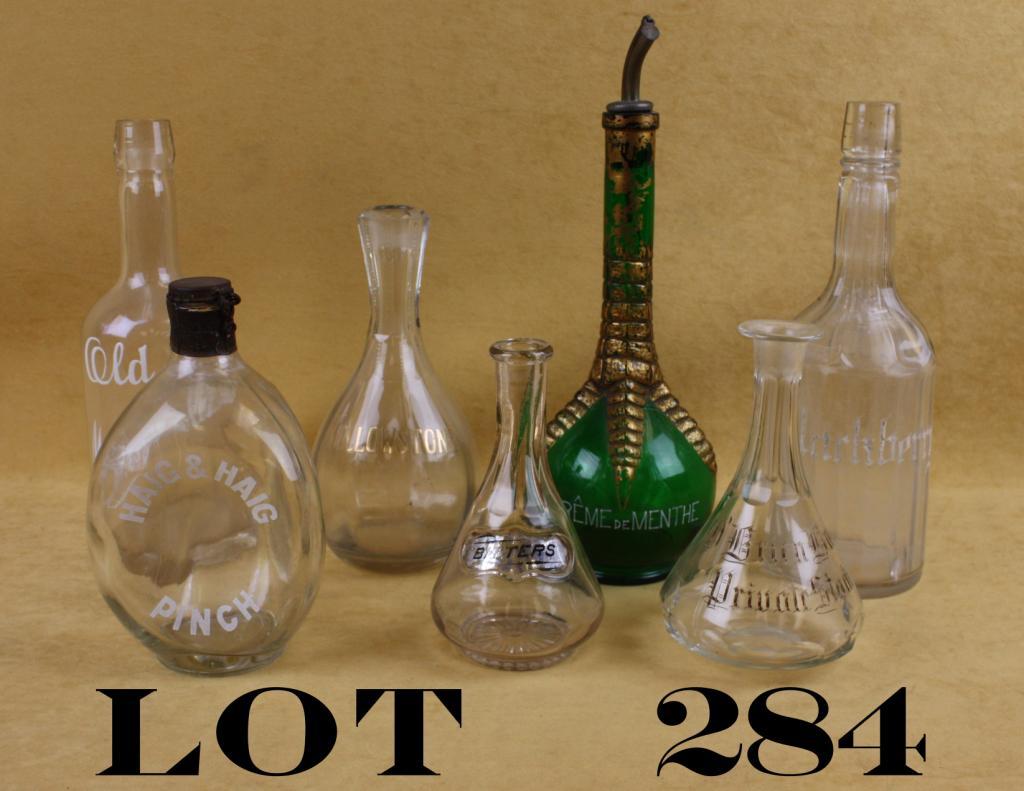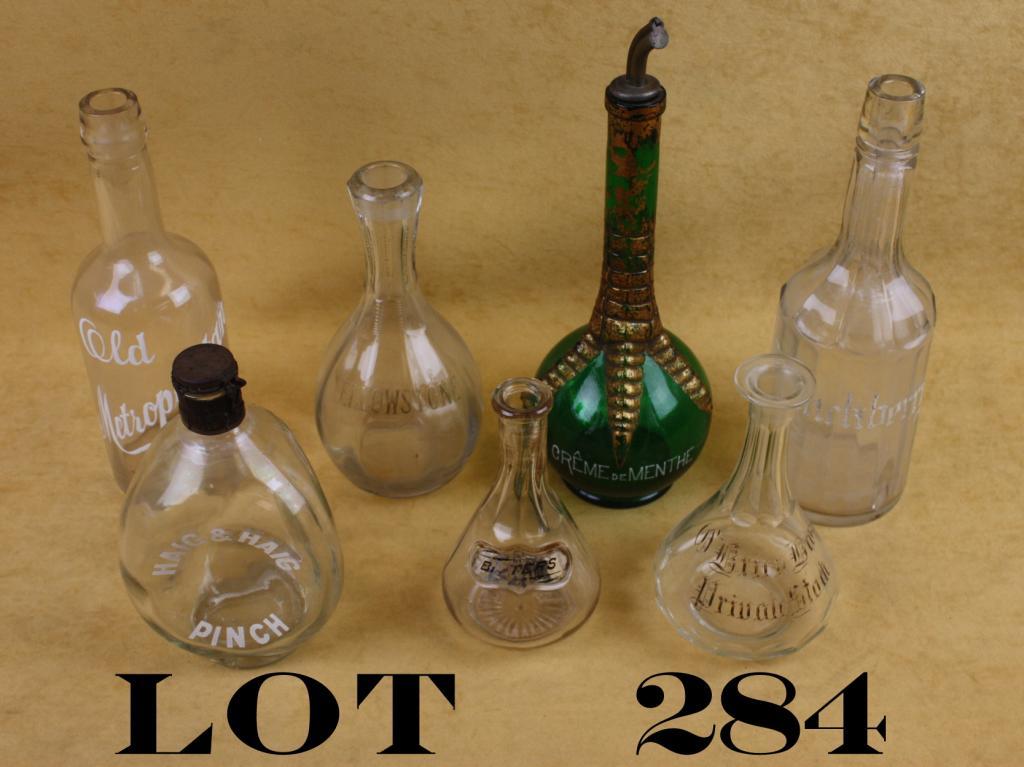Collectible lot of seven back bar bottles including a scalloped bottle marked in white enamel “Blackberry” approx. 12” in height; another bottle marked “Old Metropolitan” in white enamel approx. 11” in height; a smaller carafe marked “Yellowstone” in gold coloring approx. 9” high; a small bottle marked “Bitters” (some lettering worn off) approx. 7” high; a “pinch” bottle, approx. 8” in height and stenciled “Haig & Haig Pinch” inwhite lettering with metal cap; a smaller glass bottle, approx. 7” in height with etched lettering “O’Brien Bros. Private Stock”; and a large green colored round bottle with long neck and metal pouringspout, approx. 13” high and marked “Crème De Menthe” in white enamel and showing considerable gold paint remaining of the raised ornamentation in the glass design. The condition of all these range from fair + togood with the usual age scaling and clouding from use. Est.: $400-$800.