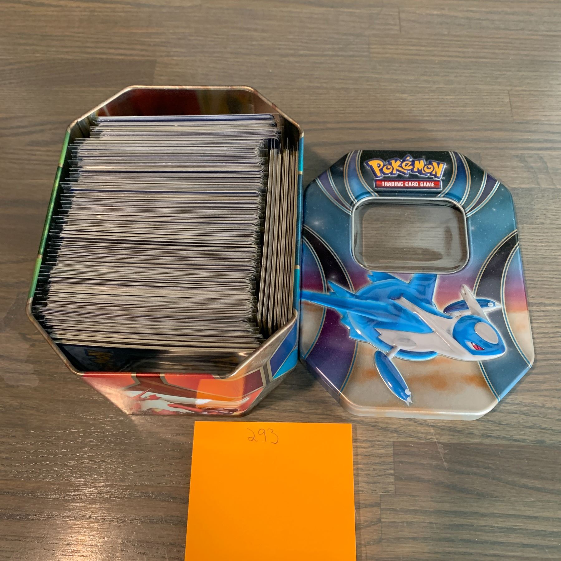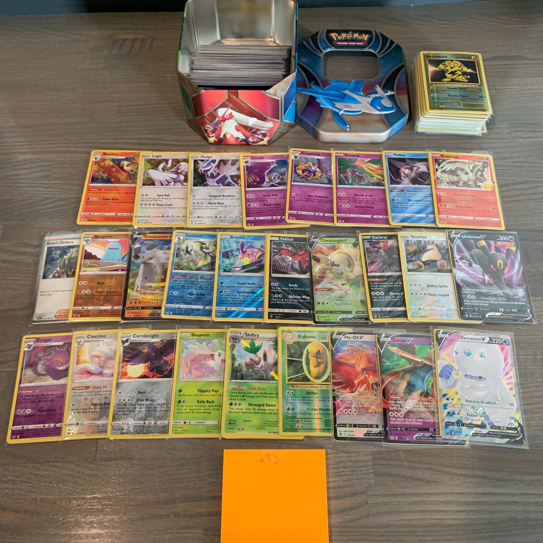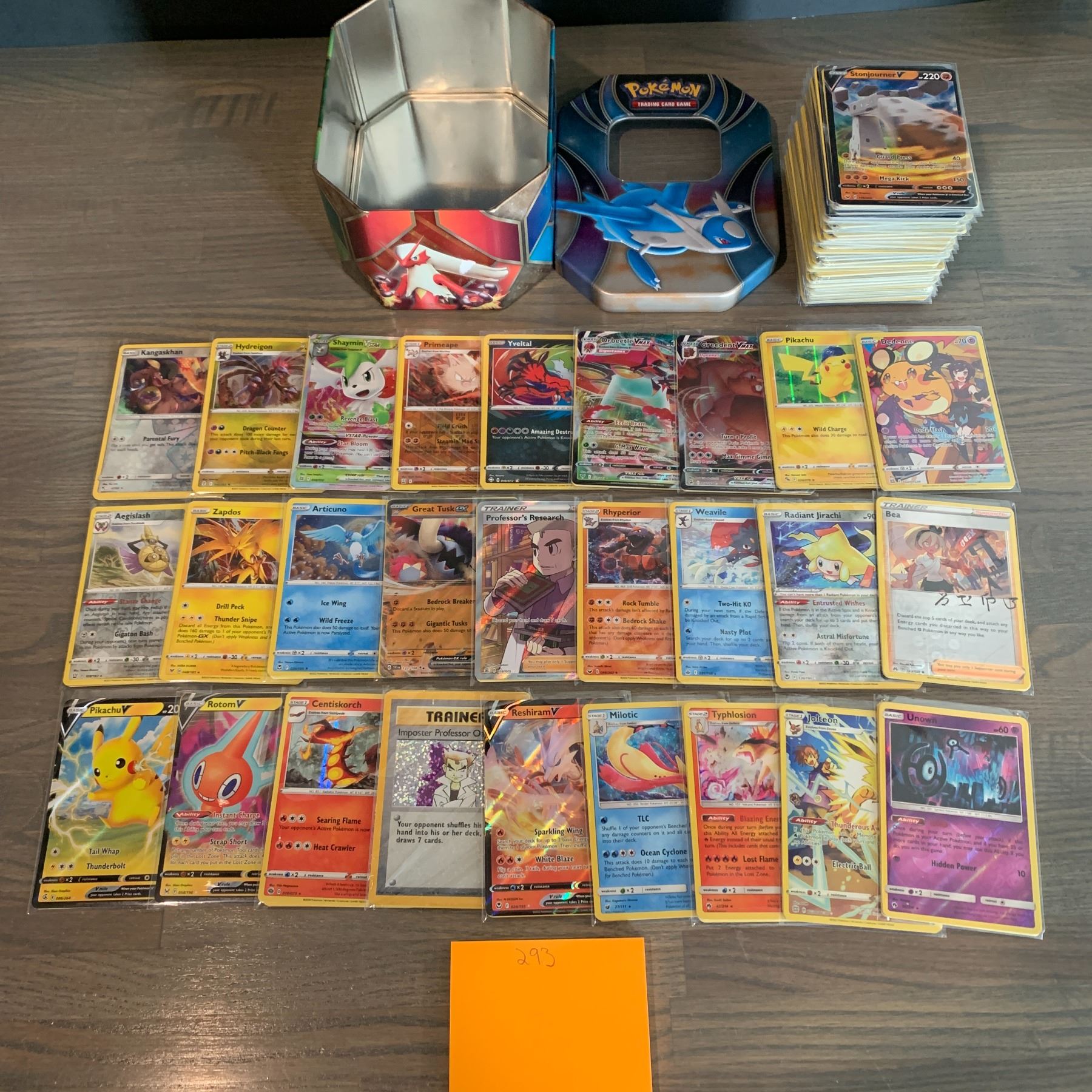 Collectible tin filled with modern Pokémon cards. Includes Vs, VMAX, trainer gallery, holos and reverse holos. We are a veteran owned company. Please look at the pictures carefully to determine what you believe the condition of collecitible is. We are currently accepting consignments. Email us a aeronhouse1994@gmail.com or visit our website, www.ahauctionhouse.com. We are currently seeking Star Wars related consignments.