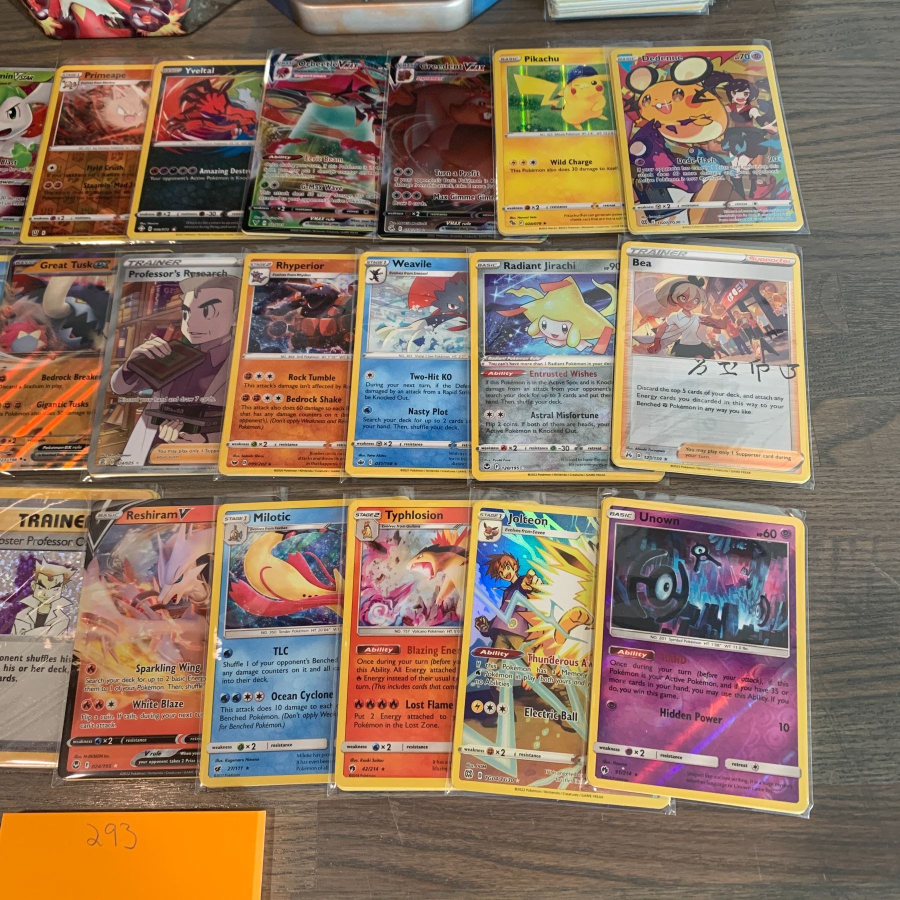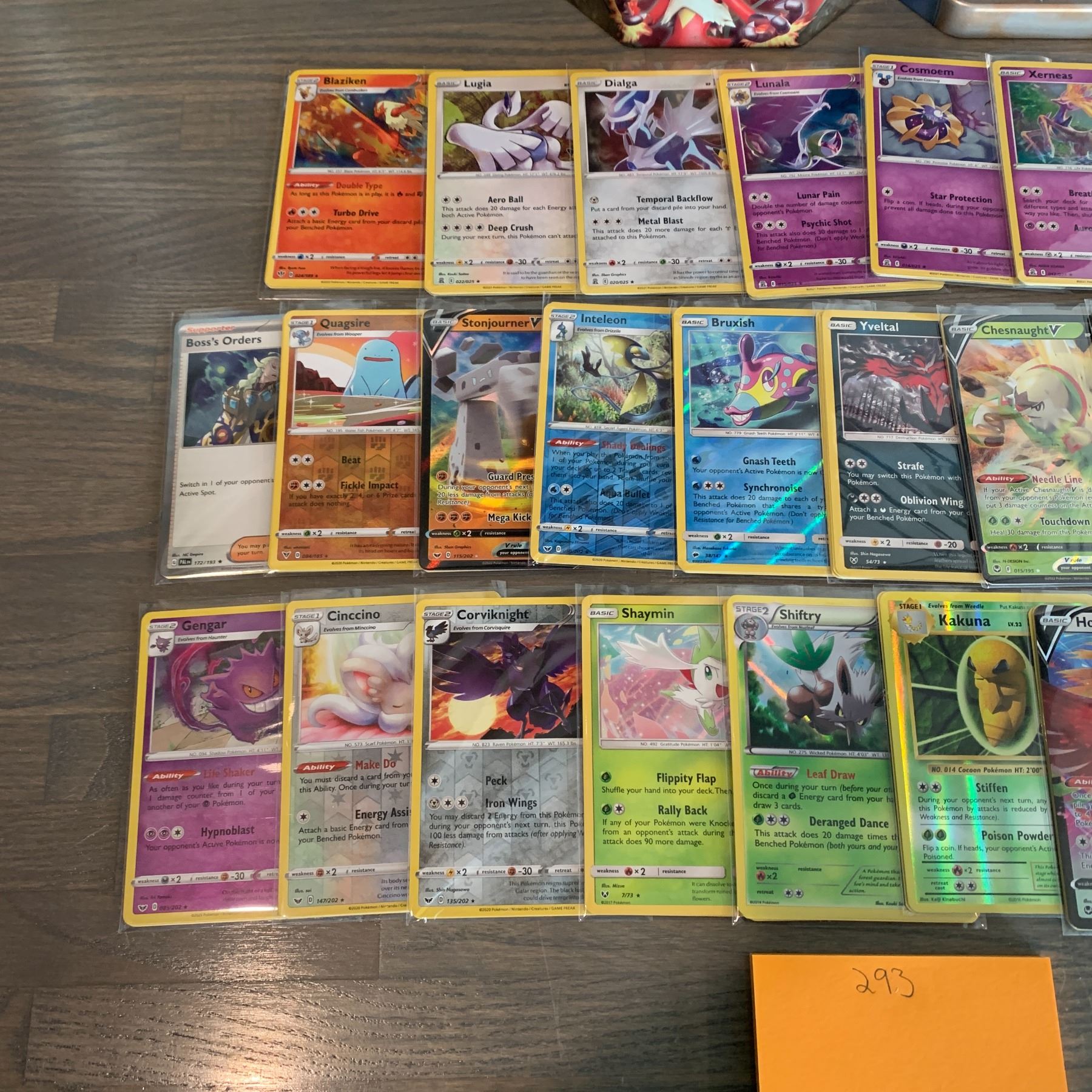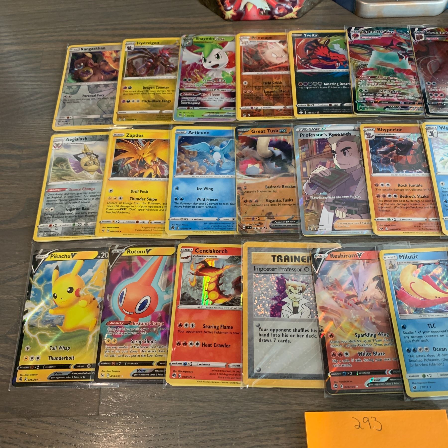 Collectible tin filled with modern Pokémon cards. Includes Vs, VMAX, trainer gallery, holos and reverse holos. We are a veteran owned company. Please look at the pictures carefully to determine what you believe the condition of collecitible is. We are currently accepting consignments. Email us a aeronhouse1994@gmail.com or visit our website, www.ahauctionhouse.com. We are currently seeking Star Wars related consignments.