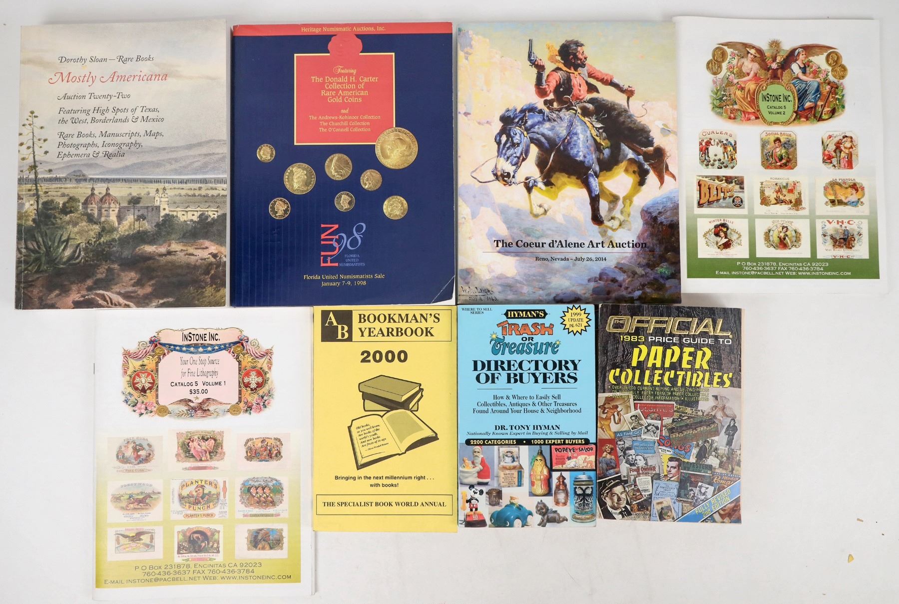 Collectibles Guides and Publications - Misc. . 1983 Paper, Trash or Treasure Directory of Buyers 8th Edition, The 2000 AB Bookman's Yearbook, Sloan Rare Books Mostly Americana Auction 22, 2014 Coeur d'Alene Art Auction catalog, 1998 Florida Numismatics Sale Heritage, and more. See photos.