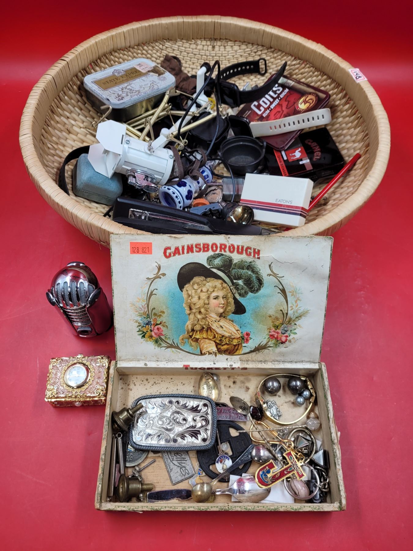 Collectibles Lot w/ Metal Belt Buckle, Collector's Spoons, Cigarette Tins, & More