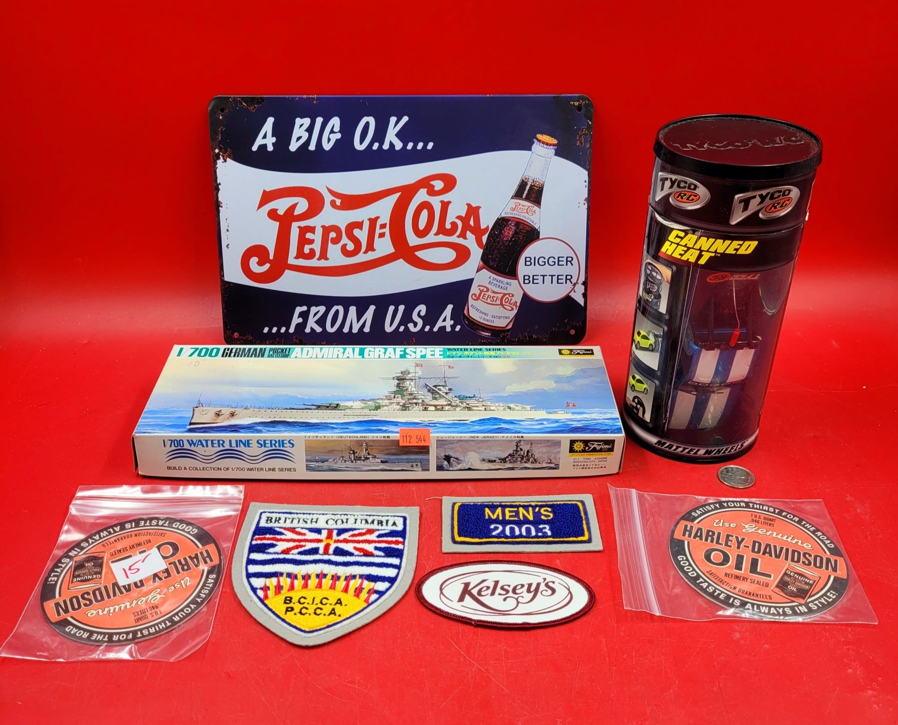 Collectibles Lot w/ Pepsi-Cola Sign, Ship Model Kit, RC Car, & Harley-Davidson Oil Coasters, & More