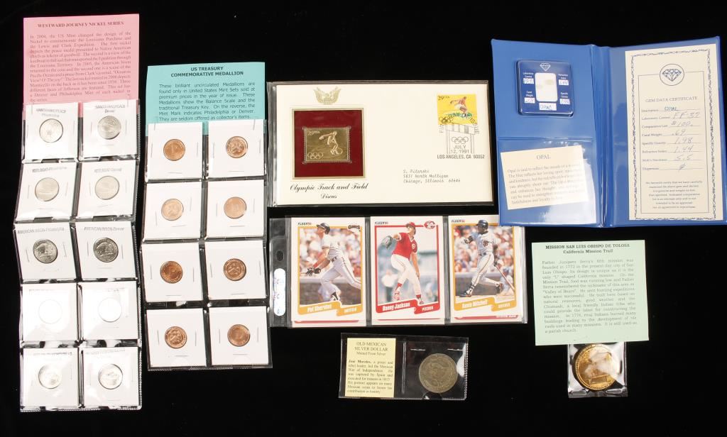 Including; US Treasury Commemorative Medallions, 24K First Day Commemorative Stamp, Westward Journey Nickels, Opal Gemstone with Certificate and properties, 9 Fleer90 Baseball Cards, California Mission Trail Medallion, and a Mexican Silver Dollar.