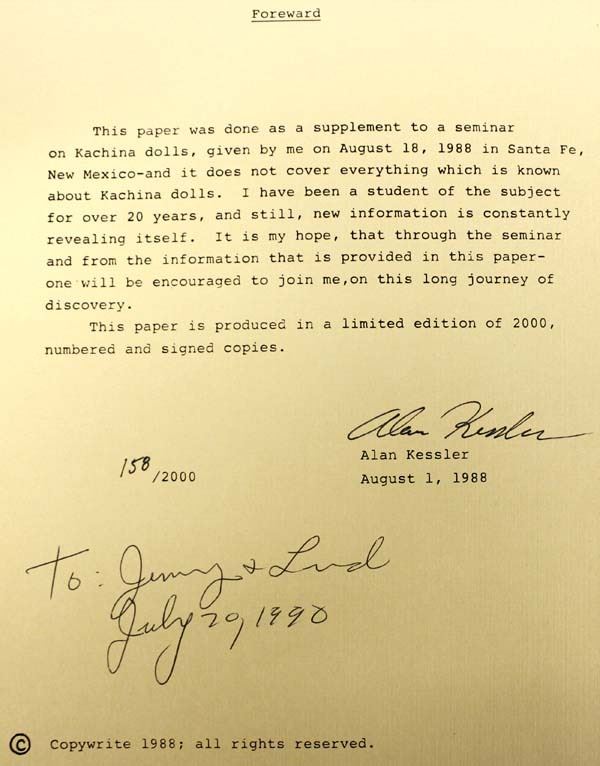 Collecting Kachina Dolls 1880-1940 by Alan Kessler, softback spiral bound book, c. 1988 and is signed and numbered by the author, #158/2000
