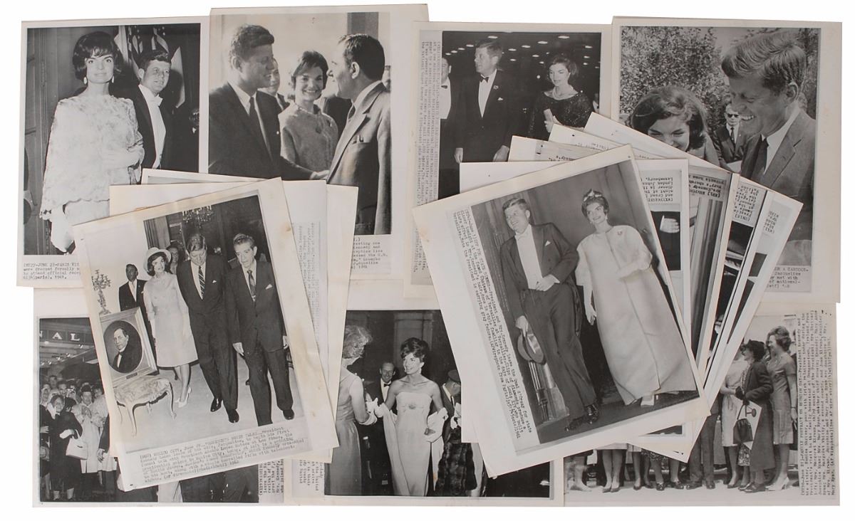 Collection of fifteen glossy wire service press photos, 8 x 10 and 10 x 8, all but one showing Jack and Jackie together at various events, including an official reception at the Quai d’Orsay in Paris, a dinner at The Breakers in Newport, a theater premiere, two of a meeting with Soviet ambassador Andrei Gromyko, an inaugural anniversary dinner, and assorted others. Most bear Associated Press Wirephoto stamps on the reverse and several are stamp-dated 1962. In overall very good to fine condition.