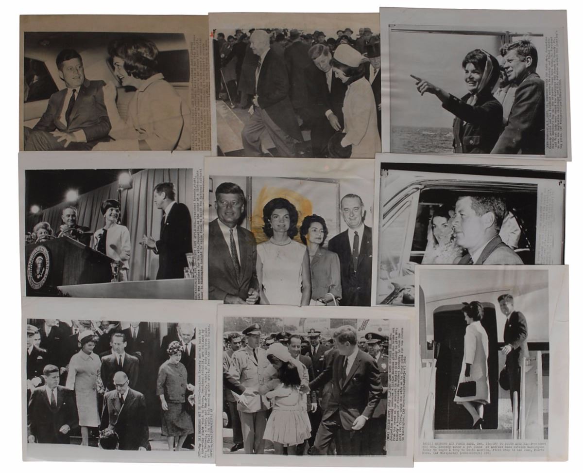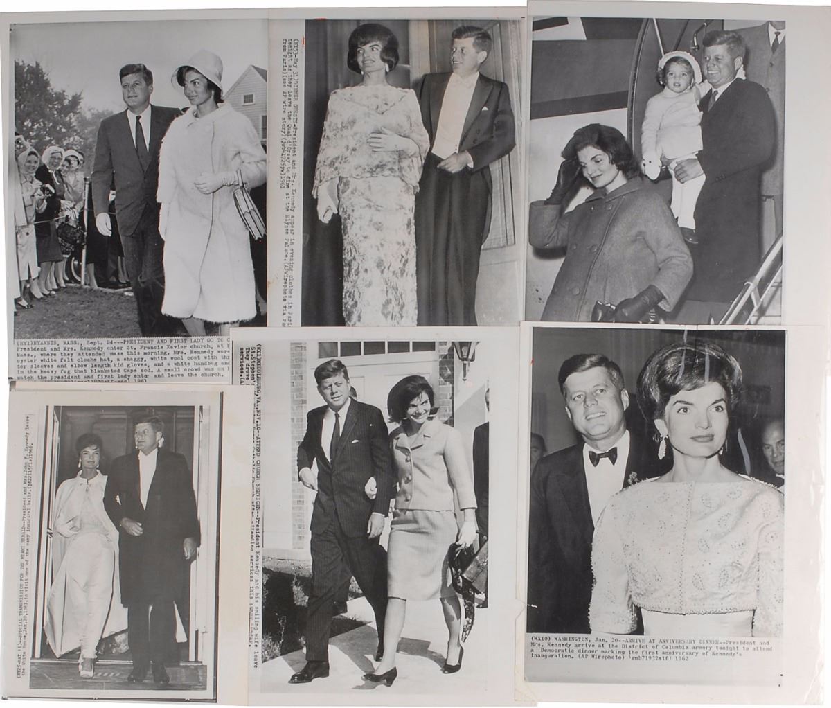 Collection of fifteen original glossy Associated Press wirephotos showing John and Jacqueline Kennedy, most approximately 8 x 10 or 10 x 8, with subjects including: the president and first lady leaving church in Hyannis; the first couple in stylish evening wear; the Kennedys with Lady Bird and Lyndon B. Johnson; JFK, Jackie, and Caroline leaving a plane; the Kennedys with Dwight D. Eisenhower; the couple watching the America’s Cup sailing race; and various others. Most are stamped on the reverse with dates between 1961 and 1964, and many retain affixed newspaper clippings. In overall very good to fine condition.