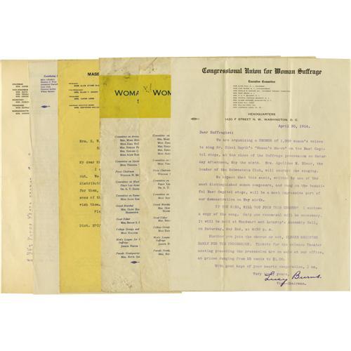 <B>Collection of 24 Woman Suffrage Group Letterheads.</B></I> Many of these carry original manuscript or typed content and average 8" x 10". The key headliner here is a fascinating 1912 letter with matching cover, both of which are decorated with hand-drawn boxes emblazoned with "Votes For Women". Other examples are from the Congressional Union for Woman Suffrage, the Massachusetts Woman Suffrage Victory Parade, the Springfield Equal Suffrage League, the Massachusetts Equal Suffrage Association, NAWSA, Leslie Woman Suffrage Continuing Committee, Empire State Campaign Committee, etc. The items in this remarkable collection show light aging as expected and average very fine condition. For collectors and scholars alike, letterheads are an important source of information about many suffragists for whom little else may be known.<BR><BR><b>Shipping:</b> Small Flat (<a target="_blank" href="http://www.heritageauctions.com/common/shipping.php">view shipping information</a>)