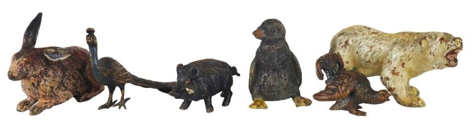 This is quite the menagerie of 19th century European cold painted bronze animal figures, including a polar bear, boar, turkey, penguin, peacock, and rabbit.