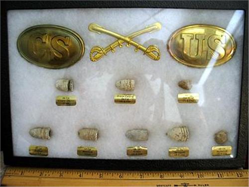 Collection 8 Civil War slugs all labeled plus reproduction U.S. & C.S. belt buckles and crossed sabers in a riker mount measures 12" x 8"