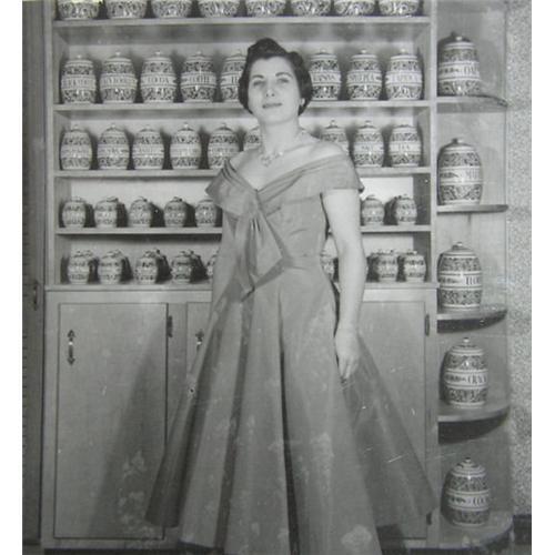 Included in this unique collection are 99 different tin glazed, hand-painted ceramic spice and ingredient jars, made by Oud Delft, in five sizes and dating from the 1940s and 1950s. Our first photograph, circa 1955, shows the original owner standing in front of a breakfront which was custom-made to display the collection. Quantities by size are as follows: (6) 9" high and 5.6" diameter; (8) 8" high and 6" diameter; (10) 7" high and 4.5' diameter; (10) 6" high and 3.75" diameter; (65) 4" high and 2.75" diameter. No ingredient is duplicated. The Oud Delft company was founded by Roelof Elshout in 1920 in Nijmegen Netherlands. In 1996 it moved to Waddinxveen and was acquired by Aardewerkfabriek 't Deltsche Huys B.V.