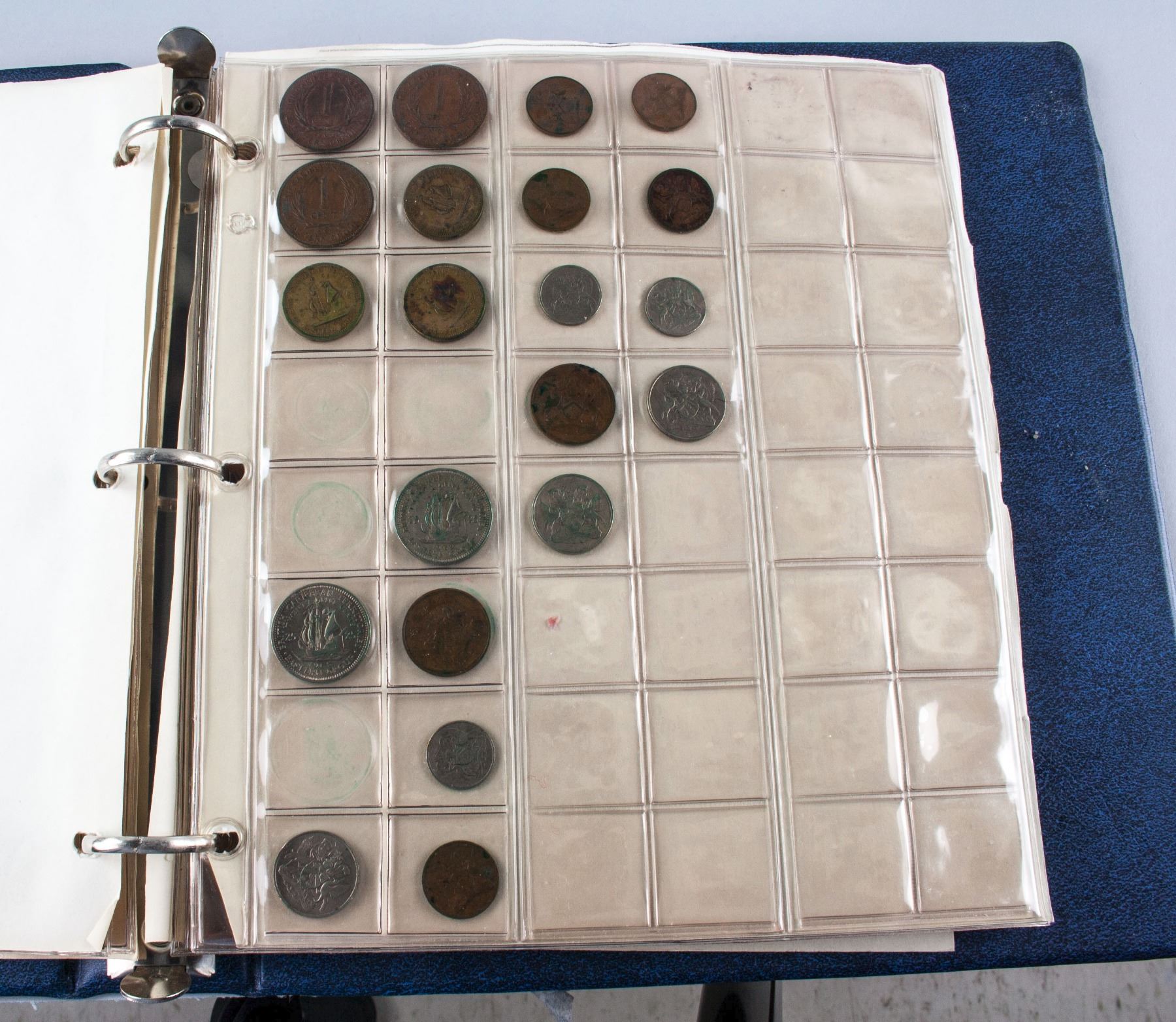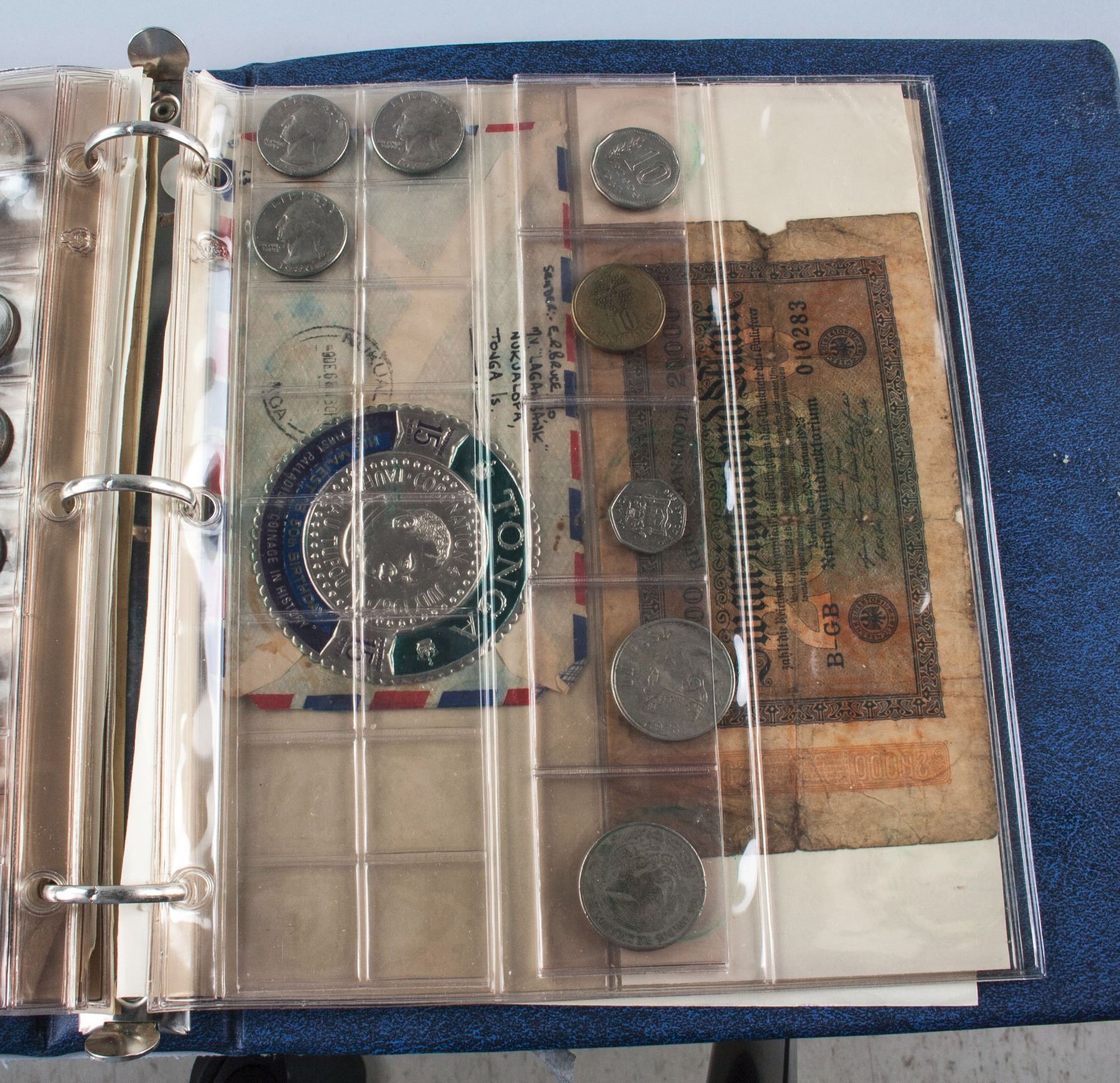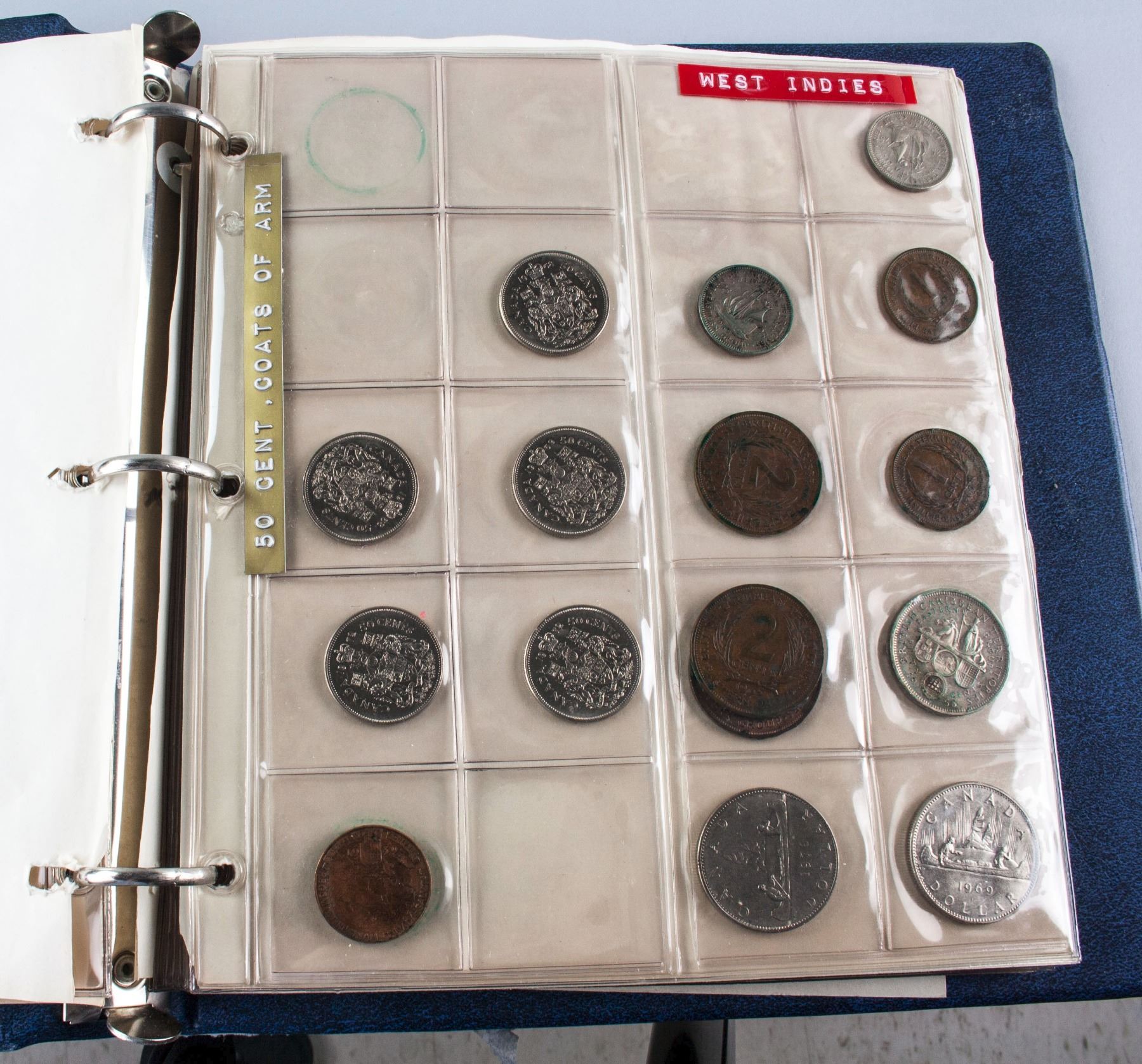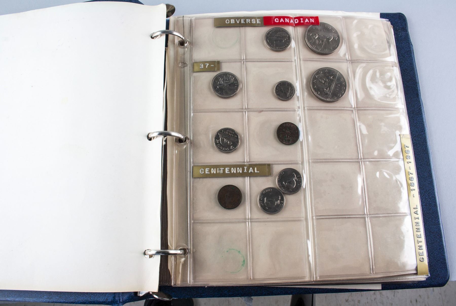 Collection book of assorted coins form various countries; comprised of 164 coins from Canada, Europe, United Kingdom and United States; one Tonga postage envelop and one German banknote; 25 cm x 24 cm, 1880 grams; Provenance: property of Bruce Robertson, Toronto local collector