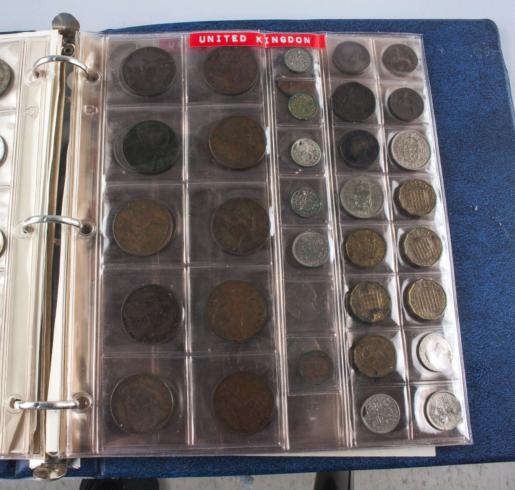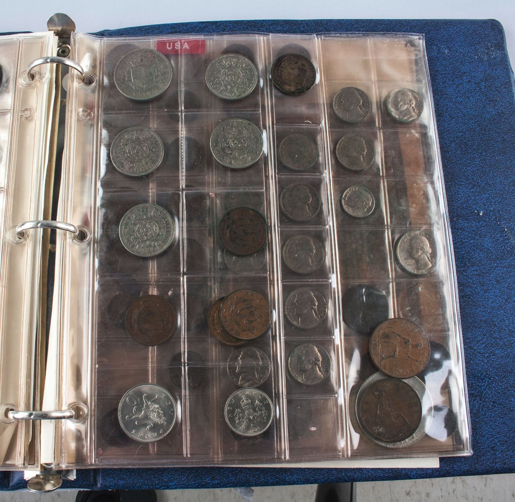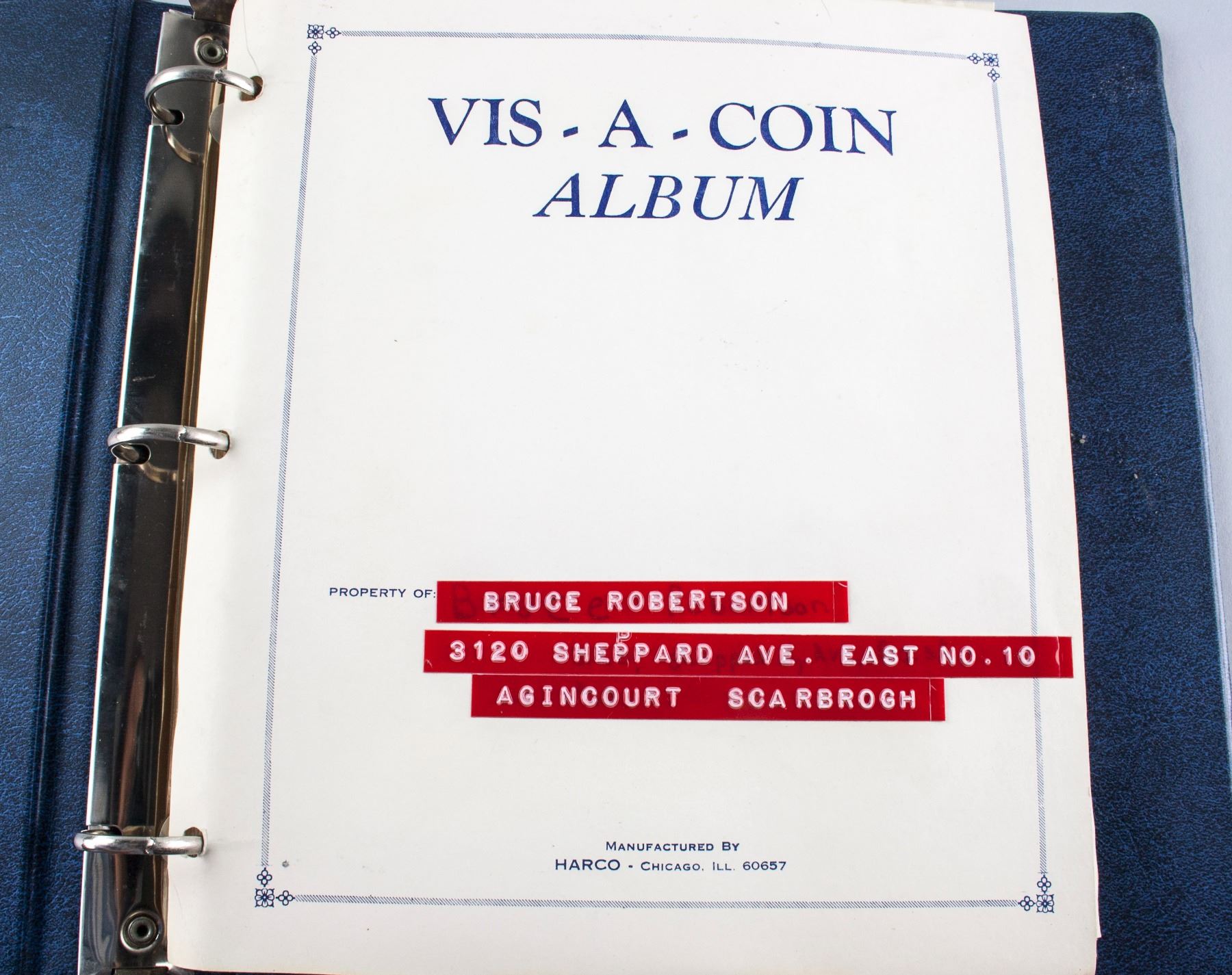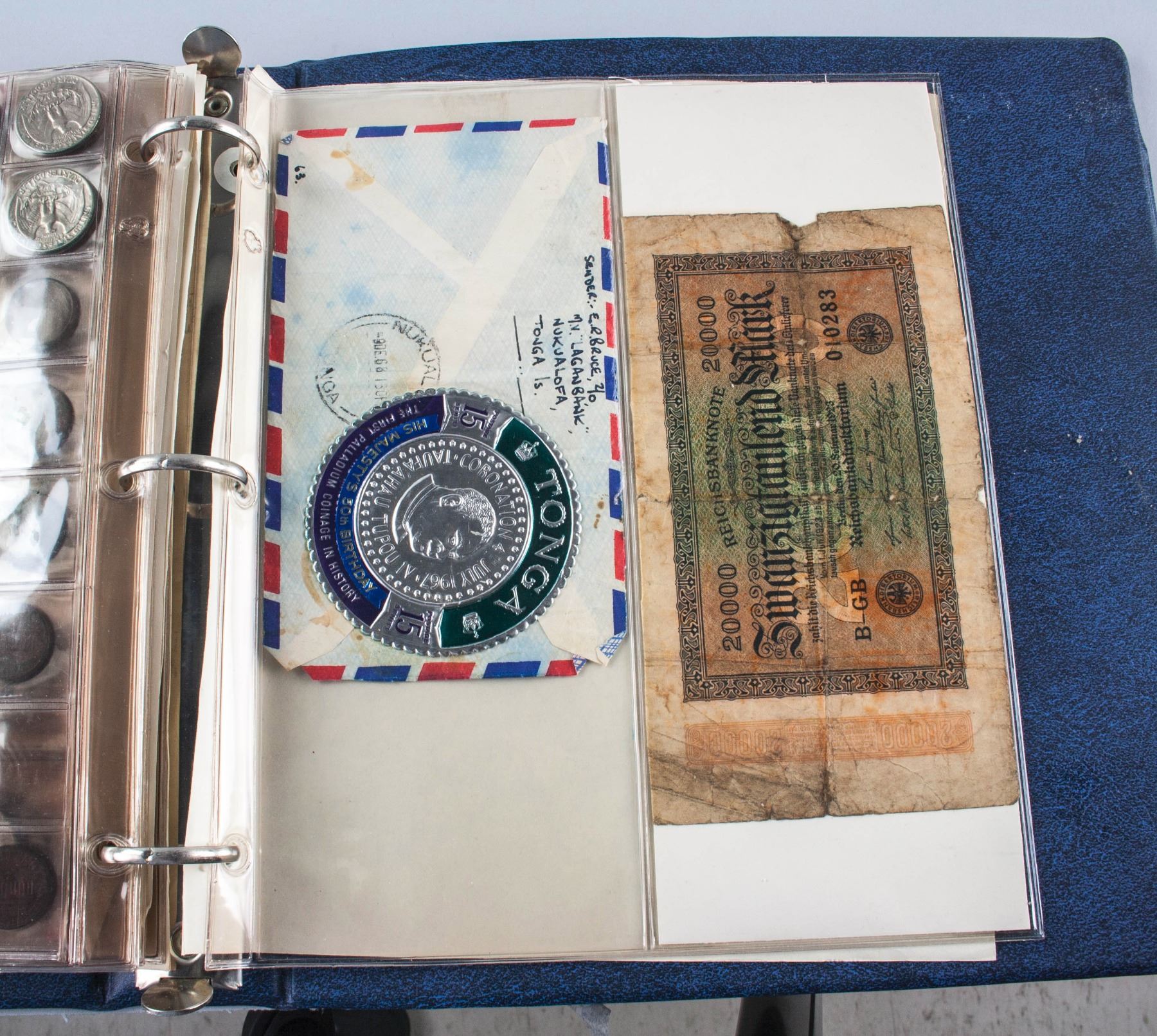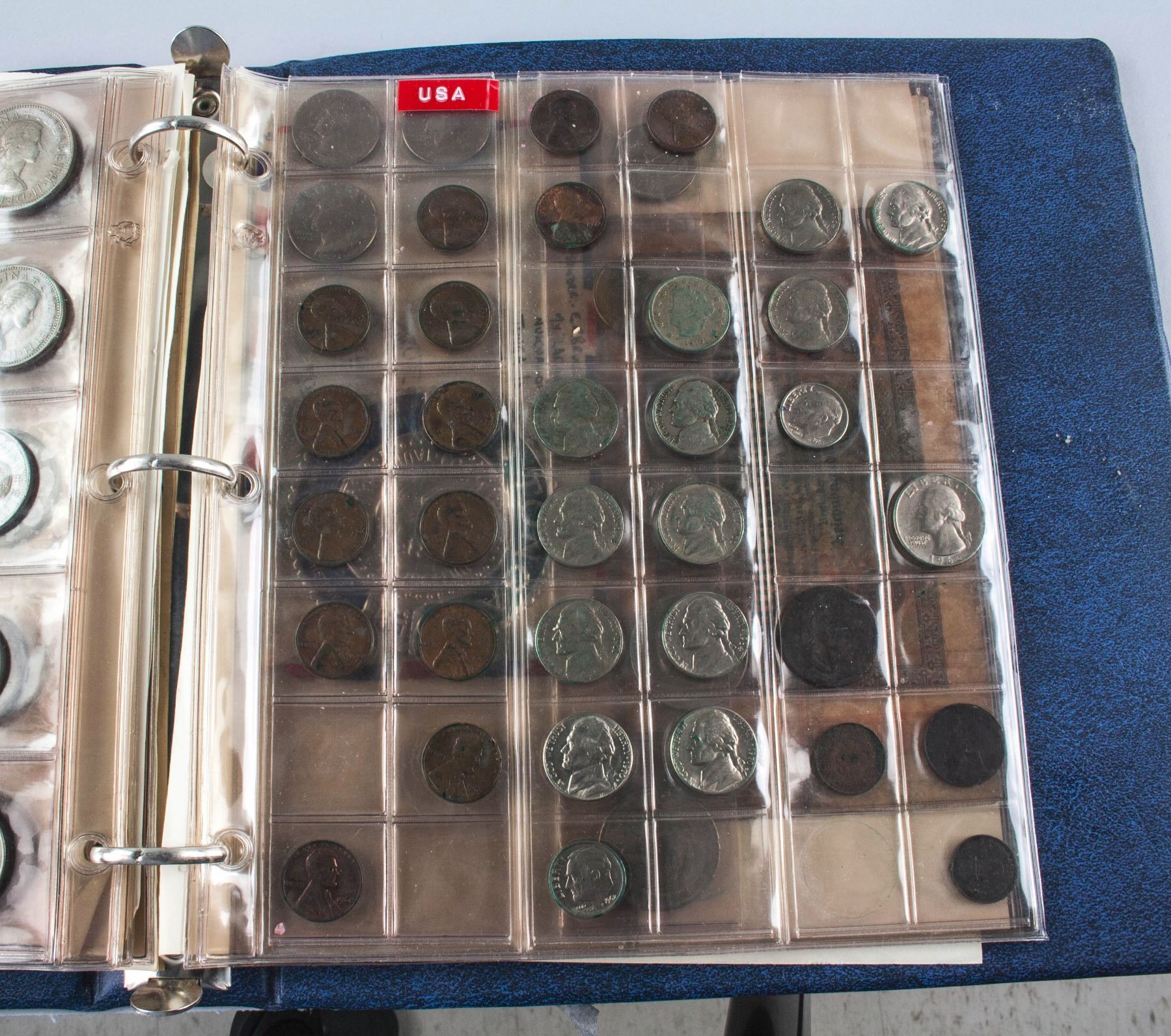 Collection book of assorted coins form various countries; comprised of 164 coins from Canada, Europe, United Kingdom and United States; one Tonga postage envelop and one German banknote; 25 cm x 24 cm, 1880 grams; Provenance: property of Bruce Robertson, Toronto local collector