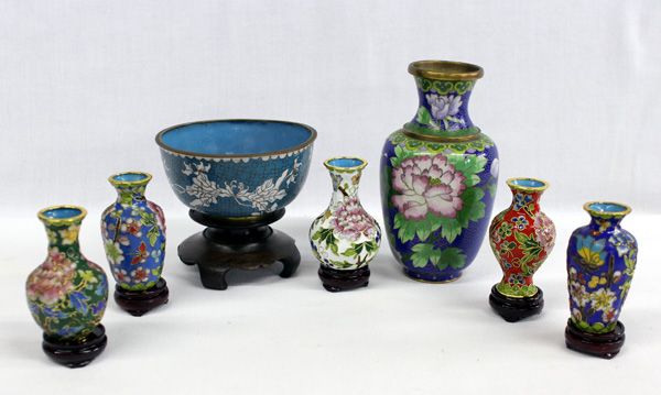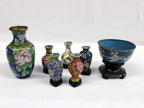 Collection of small and large Chinese Cloissone' vases, including a collection of 5 minatures on wooden stands. Tallest vase is approx. 6''H x 3.5''W.
