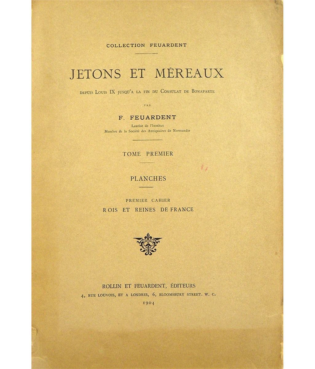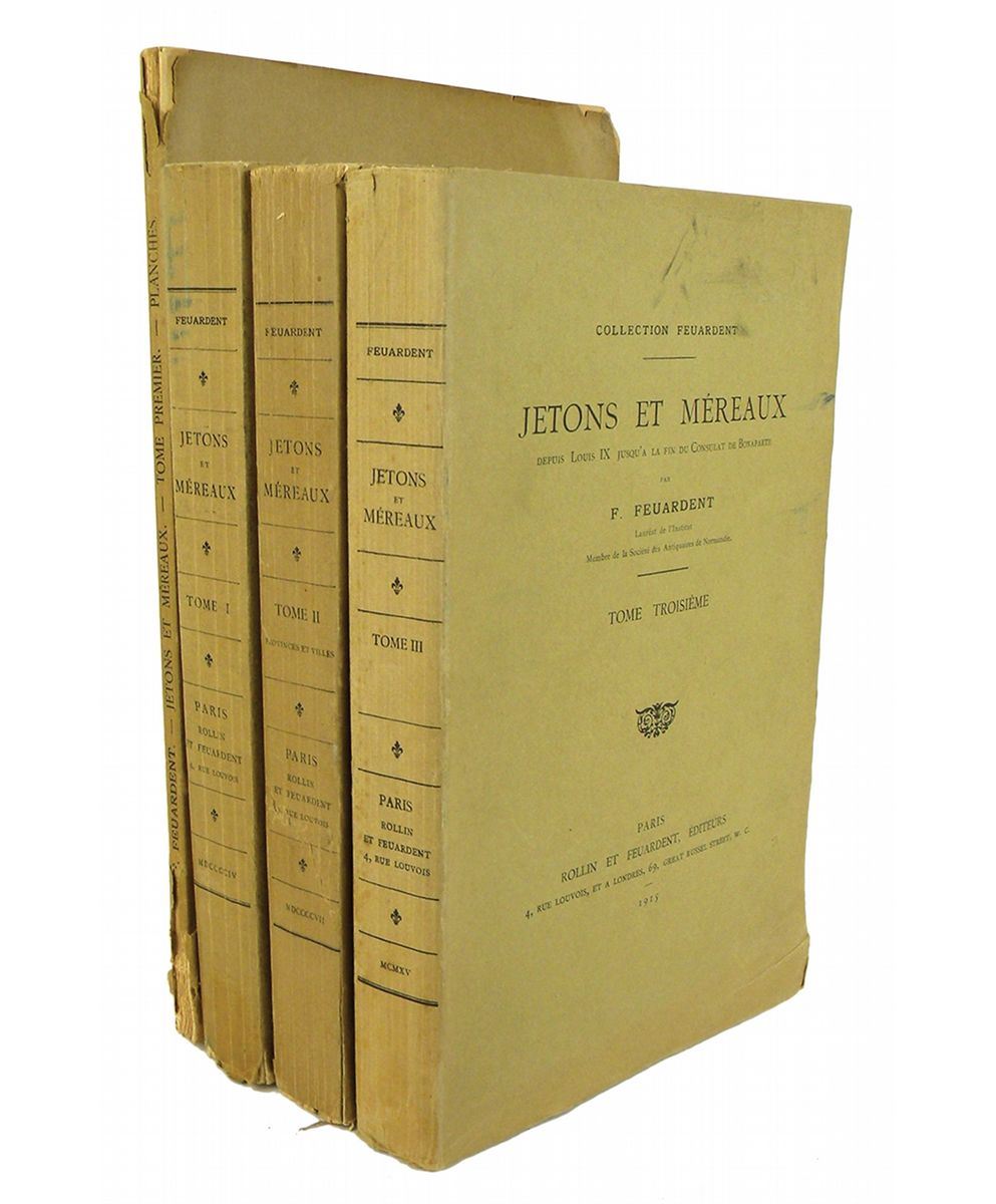 Feuardent, F. COLLECTION FEUARDENT: JETONS ET MÉREAUX DEPUIS LOUIS IX JUSQU'À LA FIN DU CONSULAT DE BONAPARTE. Paris, 1904, 1907 & 1915. Three text volumes and one plate volume, complete. Text volumes 8vo; plate volume small 4to, original matching printed tan wraps. xvi, 502, (2); 16; (4), 516, (2); (4), 506 pages; size scales; 22 fine plates. Moderate wear to wraps; corner bump. Still near fine. The rare original edition. A foundational work, still of considerable utility. Clain-Stefanelli 13819.