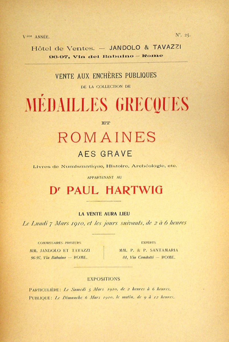 Santamaria, P. & P. MÉDAILLES GRECQUES ET ROMAINES, AES GRAVE, LIVRES DE NUMISMATIQUE, HISTOIRE, ARCHÉOLOGIE, ETC. APPARTENANT AU PAUL HARTWIG. Rome, 7 mars 1910 et jours suivants. 4to, original printed card covers. (6), 221, (1) pages; 2029 + 306 lots; illustrated throughout and on 28 very fine plates. Rear cover with old fold; else fine. An unusually nice copy of the firm's second auction, offering a major collection with outstanding plates. Very scarce. Clain-Stefanelli 1730. Grierson 283. Spring 638 [also listed under "Most important sales of ancient Greek coins"].