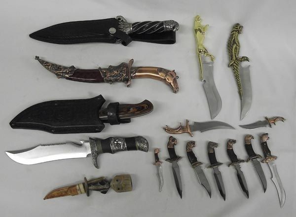 Collection Knives & Sheaths. Longest knife measures approx. 12 1/2'', longest sheath measures approx. 13 1/4'' long. Knives with animal heads on one end etc.