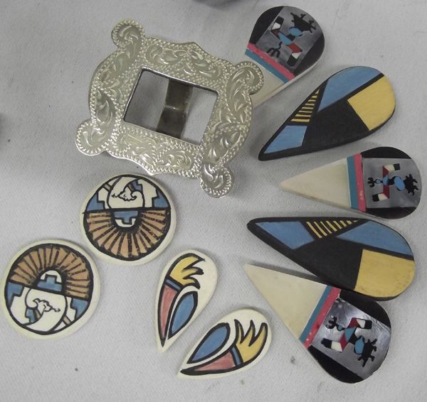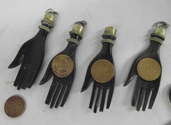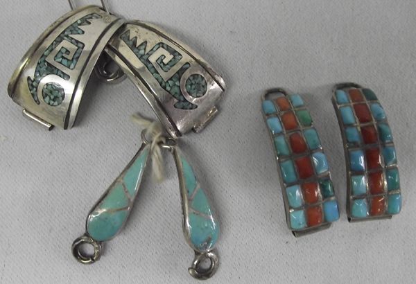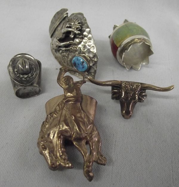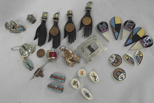 Collection of Miscellaneous Jewelry, including arrowhead silver turquoise ring (size 3.75, Navajo Turquoise Watch Tips, Unusual Bone Hand & Penney Pendants (measures 3"L), Miscellaneous Pendants & More.
