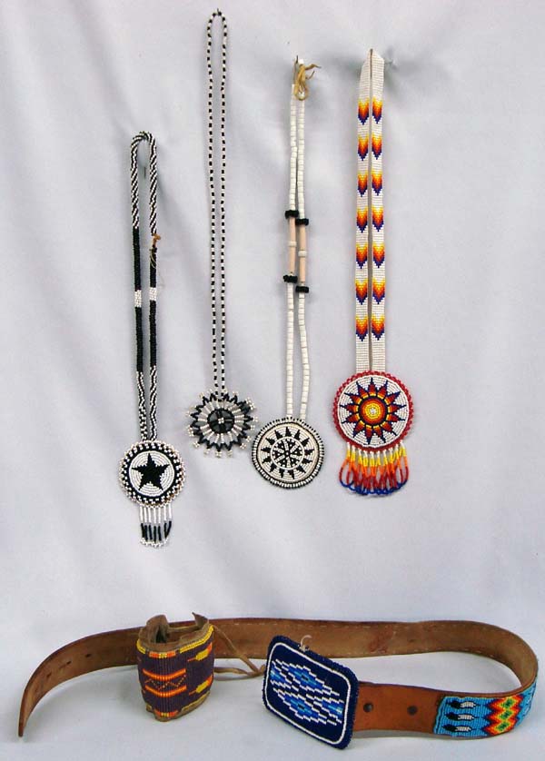 Collection Native American Beaded Necklaces & Belt & Beaded Bracelet. Longest necklace measures approx. 18''. Belt says ''E. Garcia'' in bead work. Belt measures approx. 32'' end to end not including buckle, buckle measures approx. 4 1/3'' x 3 1/3'', some missing beads on buckle. Buyers Pay Actual Shipping and Handling Charges(see terms and conditions for more information).