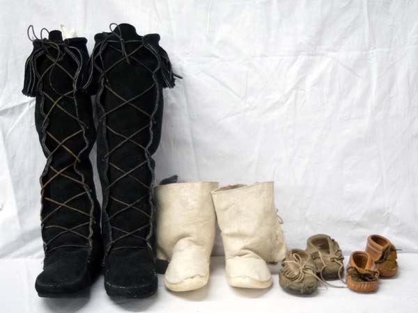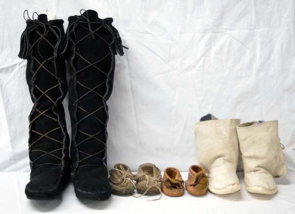 Collection of 4 Pairs of Moccasins, 2 are Native American, includes pair of high top fringed moccasins with rubber soles (11''L x 17''H), Navajo Youth Doeskin Ankle High Moccasins (9''L x 6''H), 2 child's pair of moccasins (5''L x 2.5''W)