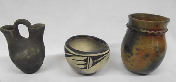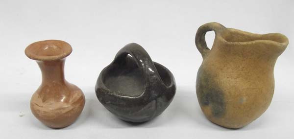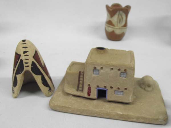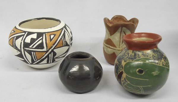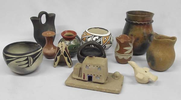 Collection Native American Pottery. Largest piece measures approx. 5''H x 3 1/2''W. Acoma, Santa Clara, some micaceous clay, etc. Some chips and shelf wear. Buyers Pay Actual Shipping and Handling Charges(see terms and conditions for more information).