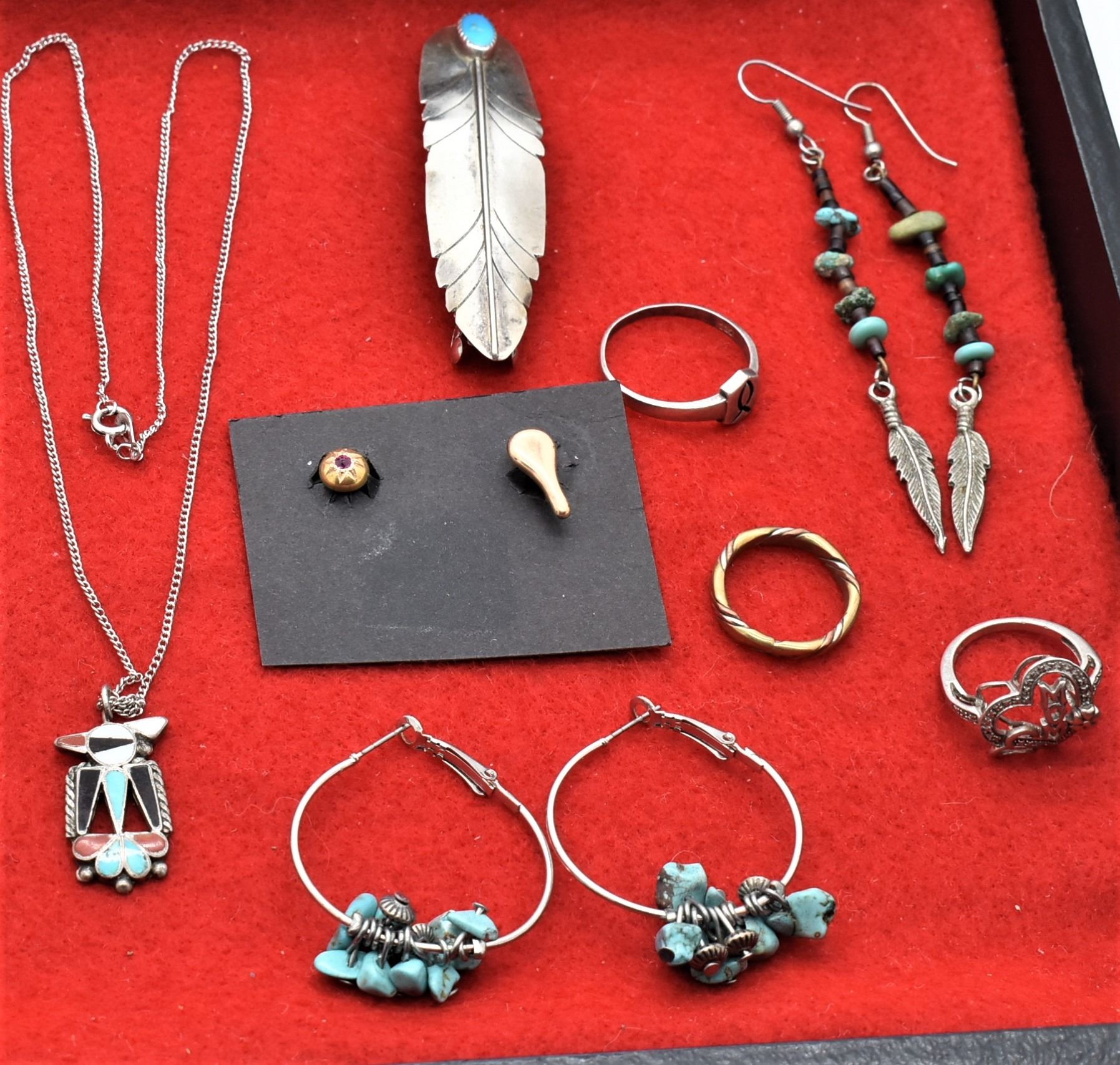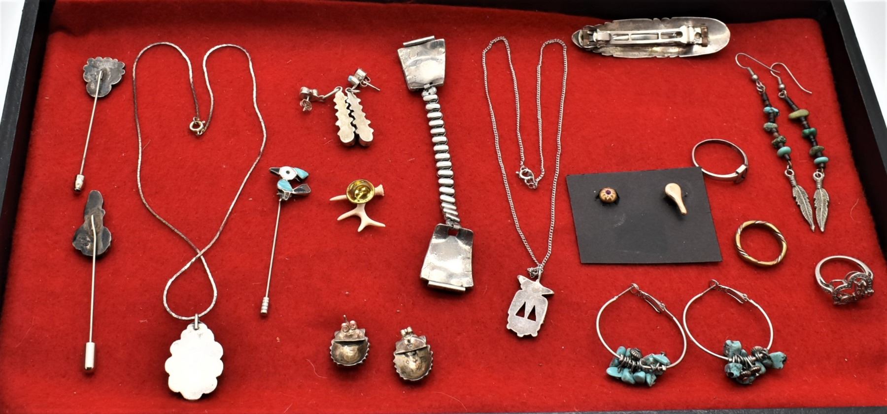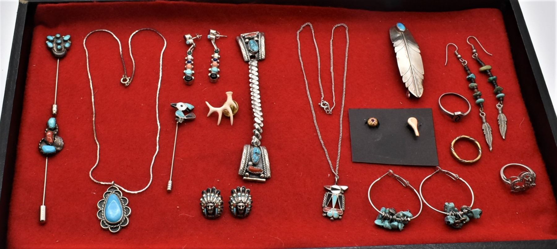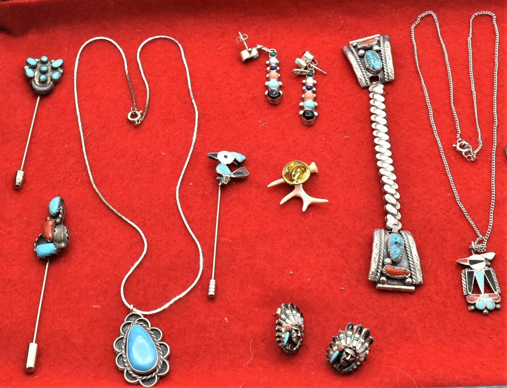 Collection of Native American Sterling Jewelry Plus, Most of it Sterling Silver, includes 1. Vintage Gold Filled Estate Single Cufflinks, one is marked ''Gold Filled B.A'', longest measures .75''L 2. Navajo Sterling Turquoise & Coral Watch Band, tips measure 1'' x 7/8'' 3. Zuni Sterling Inlay Roadrunner Stick Pin, roadrunner measures 5/8'' x .75'', inlay includes turquoise, onyx, mother of pearl, and pipestone, overall length of 2.75''L 4. Miniature Carved Bone Elk Antler Tie Tack, measures 1'' x 1'' 5. Navajo Sterling Turquoise Feather Barrette, measures 3''L x 1''W, stamped sterling 6. Navajo Sterling Turquoise Pendant Necklace, pendant measures 1.25''L x 7/8''W, chain measures 17''L 7. Zuni Old Pawn Sterling Inlay Thunderbird Pendant Necklace, pendant measures 1''L x .75''W, inlay includes turquoise, coral, onyx, mother of pearl, and pink mother of pearl, chain measures 18''L end to end 8. Zuni Turquoise Stick Pin by A. Ondelacy, measures 2.75''L x 5/8''W and is hallmarked 9. Navajo Sterling Turquoise and Coral Stick Pin, meaures 3.25''L x .5''W 10. Navajo Silver Bead & Turquoise Nugget Hoop Earrings, measures 1.5''L x 1.25''D 11. Native American Zuni Sterling Inlay Chief's Head Earrings, stamped sterling and hallmarked, measure 7/8''L x .5'', inlay includes turquoise, mother of pearl, coral, opal, and onyx 12. Navajo Sterling Multi-Stone Pierced Post Earrings, measure 1.75''L x .25''W 13. Navajo Sterling Shell Heishi and Turquoise Pierced Wire Earrings, measure 3.75''L 14. Navajo Sterling Copper Ring, size 8 15. Sterling Diamond Chip Mom Ring, size 6, stamped .925 16. Sterling Agape Ring, size 12