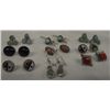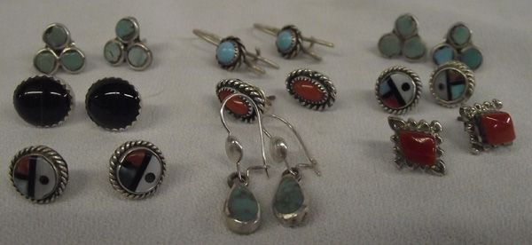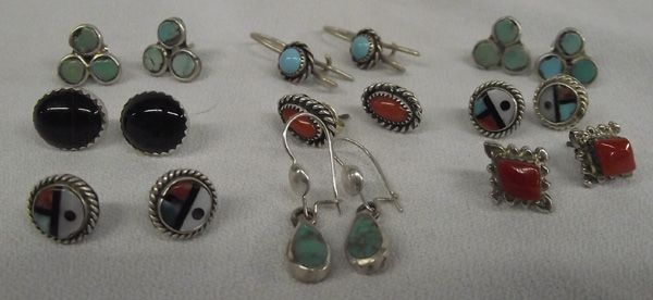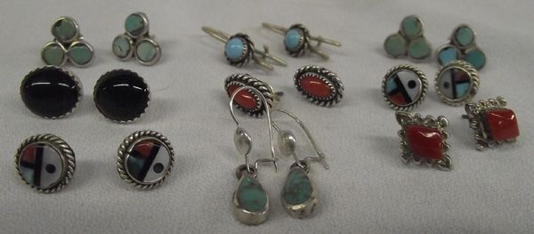 Collection Navajo & Zuni Silver Pierced Earrings. 9 pair all together. 1) Oval Onyx post earrings with sawtooth bezel. 2) Coral posts set in sawtooth bezel & twisted rope accents. 3) Two pairs of Vintage Turquoise Shamrock posts. 4) Two pairs of Zuni stone inlay Sun Face posts. 5) Diamond shaped Coral post earrings. 6) Tear Drop Earrings. 7) Oval Turquoise Cabochon pierced wire earrings. The Onyx pr. measures 1/4''H x 3/8''W while the longest fishhook style measures approx. 1''L.