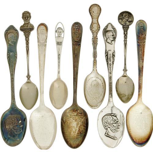 <B>Collection of Nine Abraham Lincoln Souvenir Spoons</B></I> consisting of: three identical spoons with an excerpt from the Gettysburg Address engraved in the bowl marked "W A Rogers Mfg Co" and "IS" (6" long, silverplate); two identical "The Rail Splitter" spoons marked "Greenduck Co Chicago" (6", silverplate); a 1901 "Our Martyred Presidents" spoon picturing both Lincoln and McKinley and marked "N. F. Silver Co" (5", silverplate); an Illinois Lincoln spoon (4.25", sterling); and two slightly different spoons marked only "Made in Holland" (4.5" & 4.75").<BR><BR><b>Shipping:</b> Flatware (<a target="_blank" href="http://www.heritageauctions.com/common/shipping.php">view shipping information</a>)