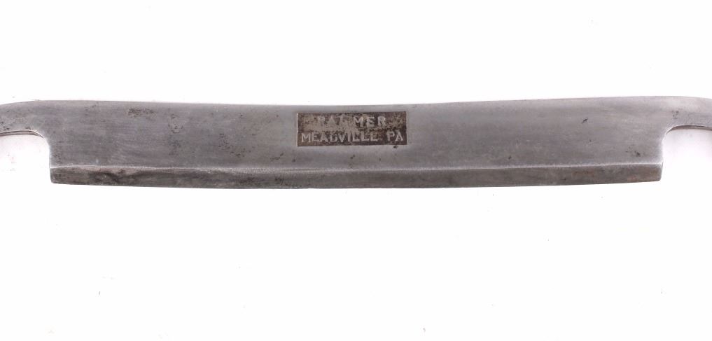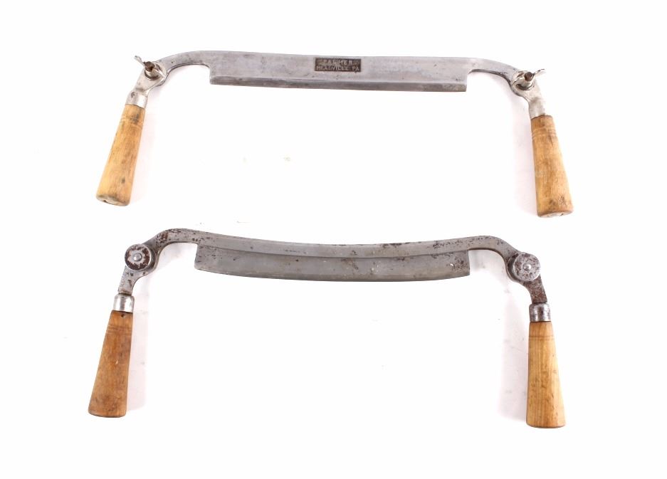 This lot features a collection of two 10" draw knives. The first in this set of two is a C.E. Jennings 10" adjustable handle draw knife. It is marked with a patent date of Feb. 20 1906. The second piece is a Palmer 10" adjustable handle draw knife. The overall condition of both pieces is good. Measures: 15" W x 3 1/2" D x 1 1/2" H, 15 1/2" W x 3" D x 1 1/2" H