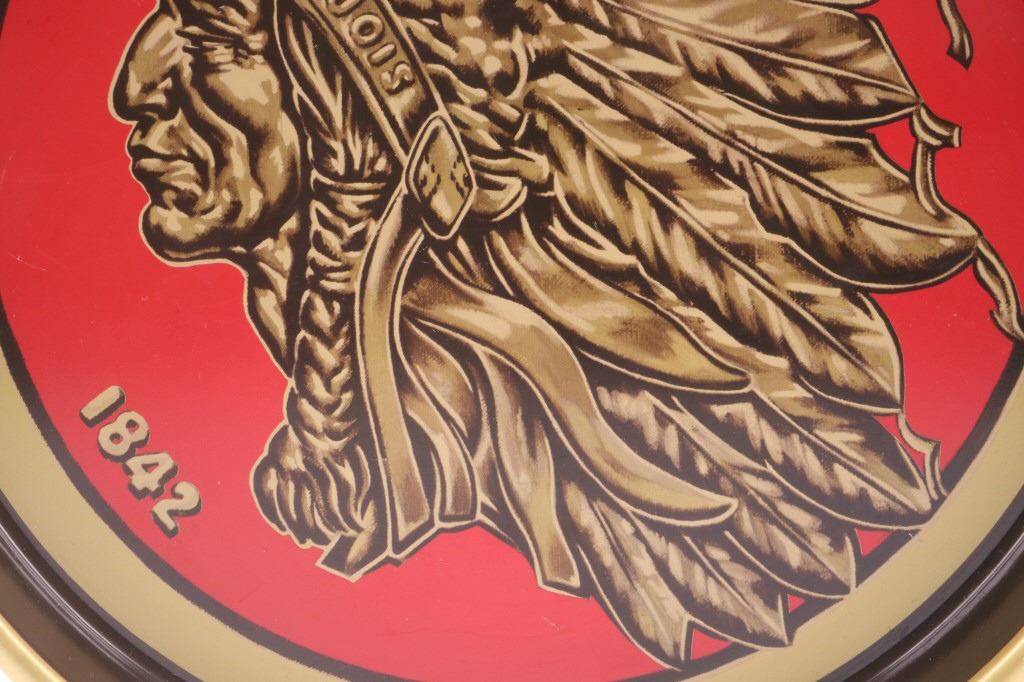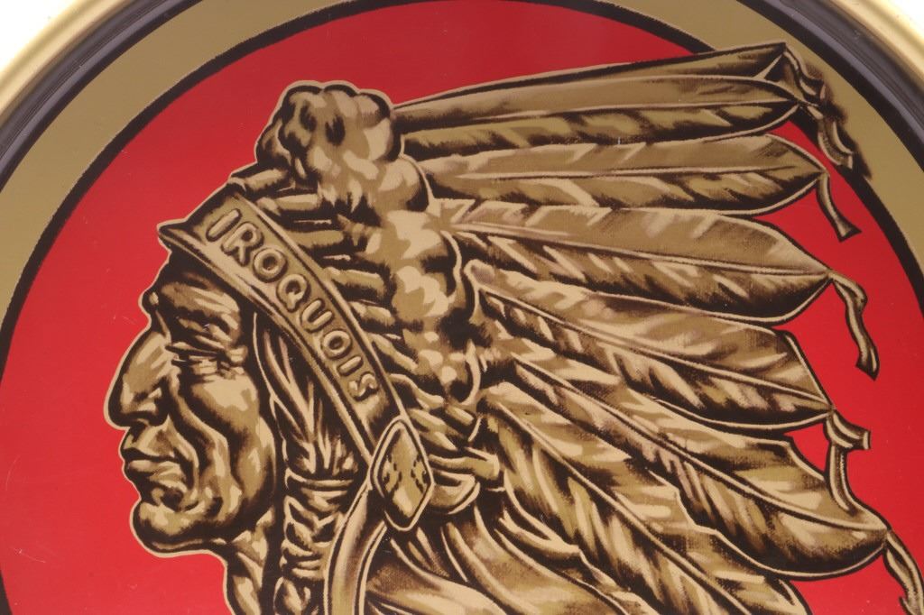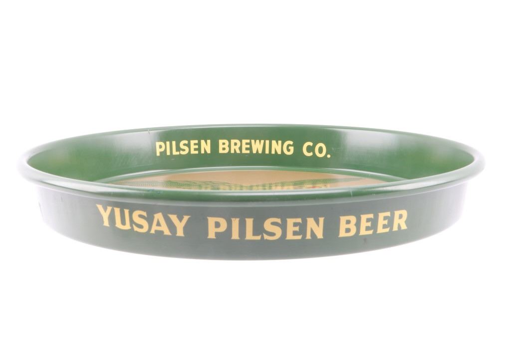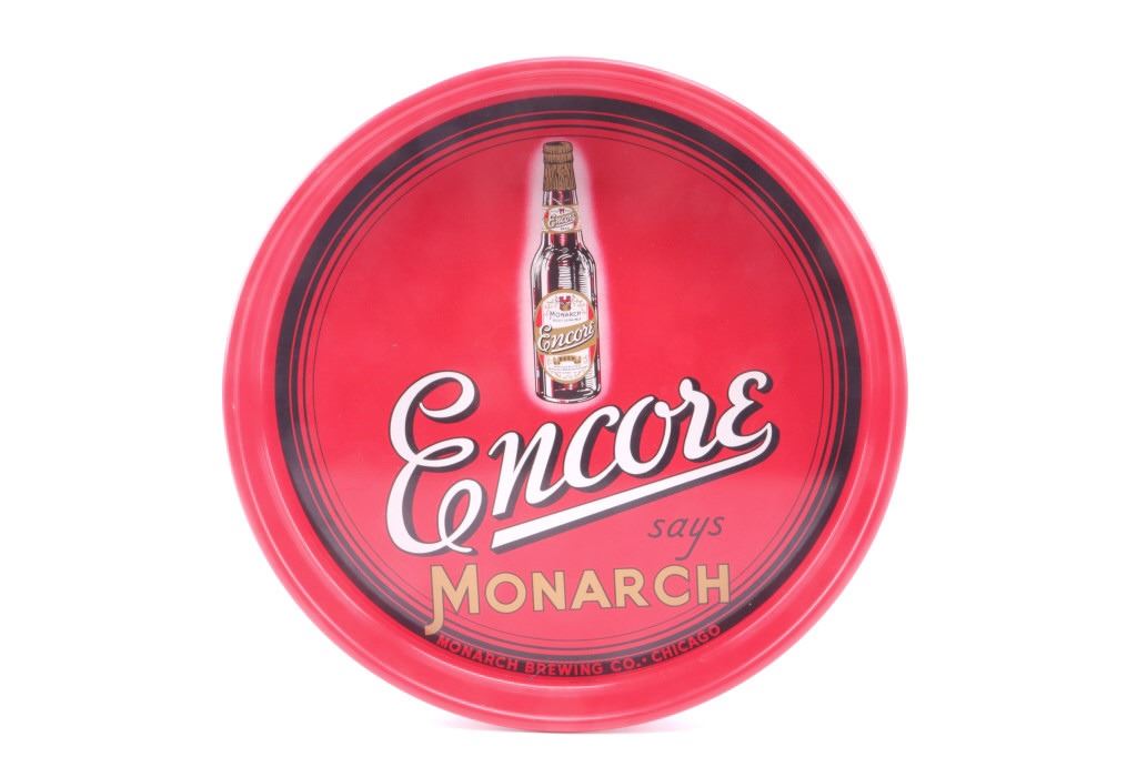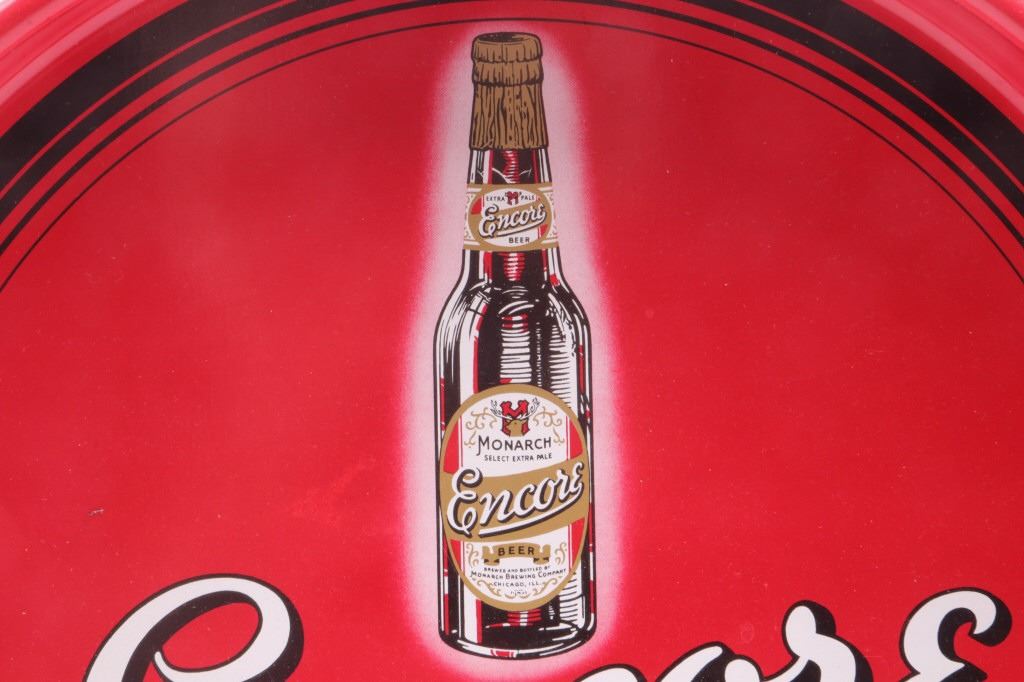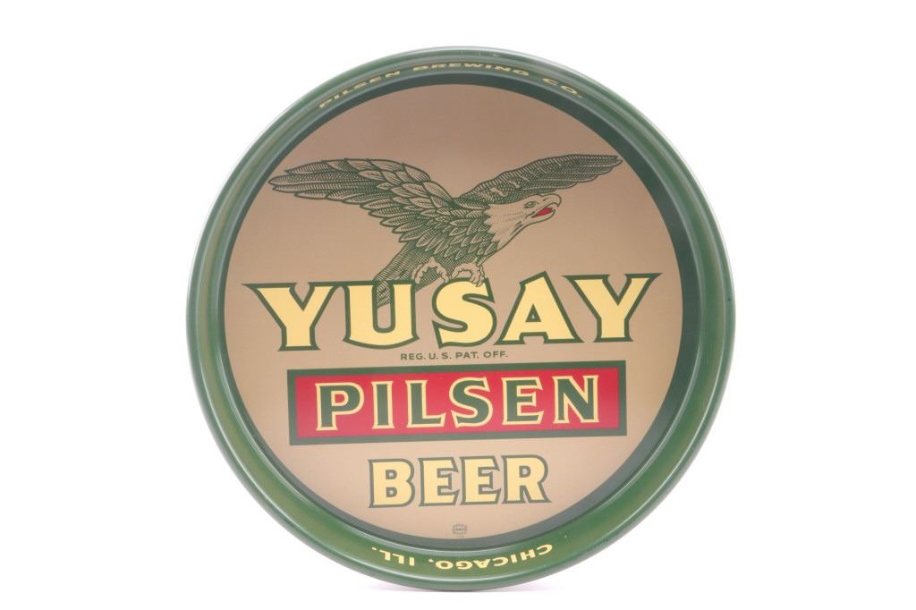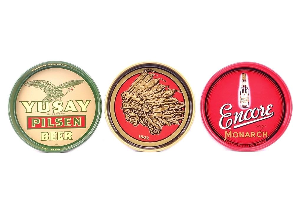 Offered in this lot is a collection of three vintage beer trays. The trays are for Iroquois Indian Head Beer, Encore Monarch Beer, and Yusay Pilsen Beer. First is the Iroquois Indian Head Beer tray. This tray is done in a brown, red, and old gold color. The center of the tray has the Iroquois Indian head logo with 1842. On the inside of the rim is "International Breweries Inc. Buffalo, N.Y.” Around the outside of the rim is "Iroquois Indian Head Beer & Ale". The next tray is for Monarch Encore Beer. This is a red tray with a bottle of Encore beer in the center and text that reads, "Encore says Monarch Monarch Brewing Co. Chicago". Around the outside rim is “Monarch Beer.” The last tray is a green, yellow, and red Yusay Pilsen Beer tray. In the center of the tray is the Yusay name and eagle with “Pilsen Beer and Reg. U.S. Pat. Off". On the inside rim is “Pilsen Brewing Co. Chicago, Ill". On the outside of the rim is "Yusay Pilsen Beer". These trays all measure 13" and are in good condition and have minor scratches.