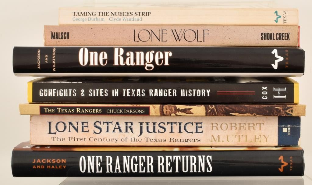 "Lone Star Justice The First Century Of The Texas Rangers." By Robert M. Utley, Paperback 2003. "Images Of America The Texas Rangers." By Chuck Parsons, paperback 2011. "Taming The Nueces Strip The Story Of The McNelly's Rangers." By George Durham, paperback 1990. "Gunfights & Sights In Texas Ranger History." By Mike Cox, paperback 2015. "One Ranger A Memoir." By Joaquin Jackson & David Marion Wilkinson, Hardback 2009. "Lone Wolf." By Brownson Malsch, singed by author hard back 1980. "One Ranger Returns." By H. Joaquin Jackson, Signed Hardback 2008.