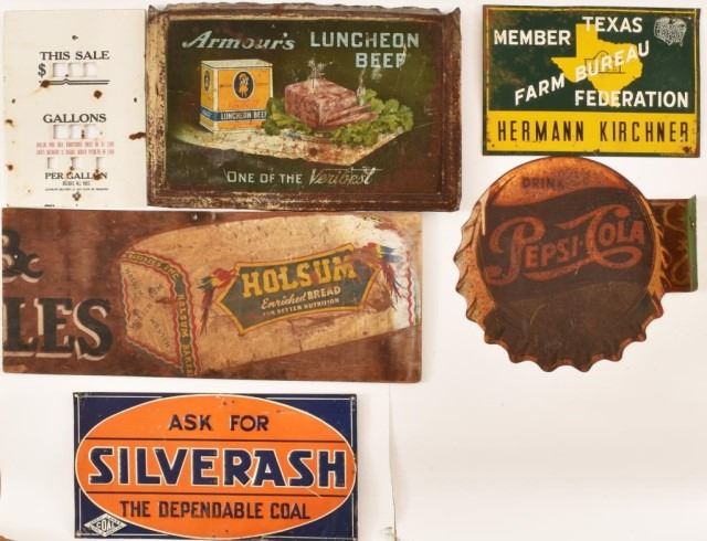 Farm Bureau Federation Tin 9.5" x 13.5", Pepsi-Cola Porcelain Flange 14", Holsum Bread Wooden 10.5" x 26", Silverash The Dependable Coal 10" x 18", Gas Pump Plate Porcelain 9" x 13", Armour's Luncheon Beef 13" x 19.5"