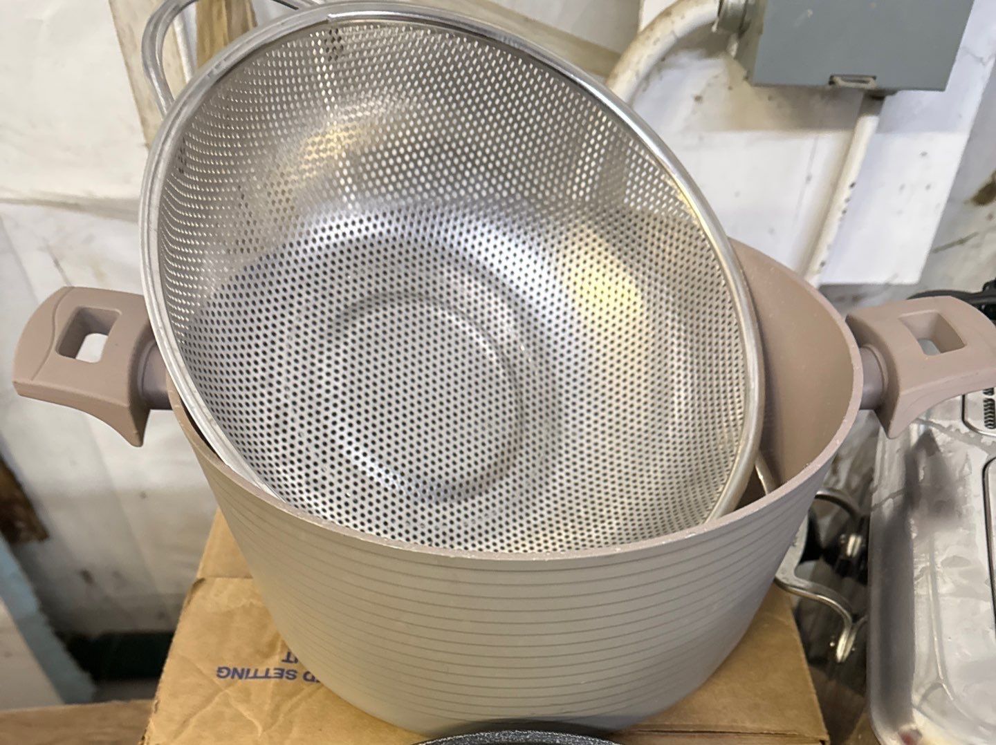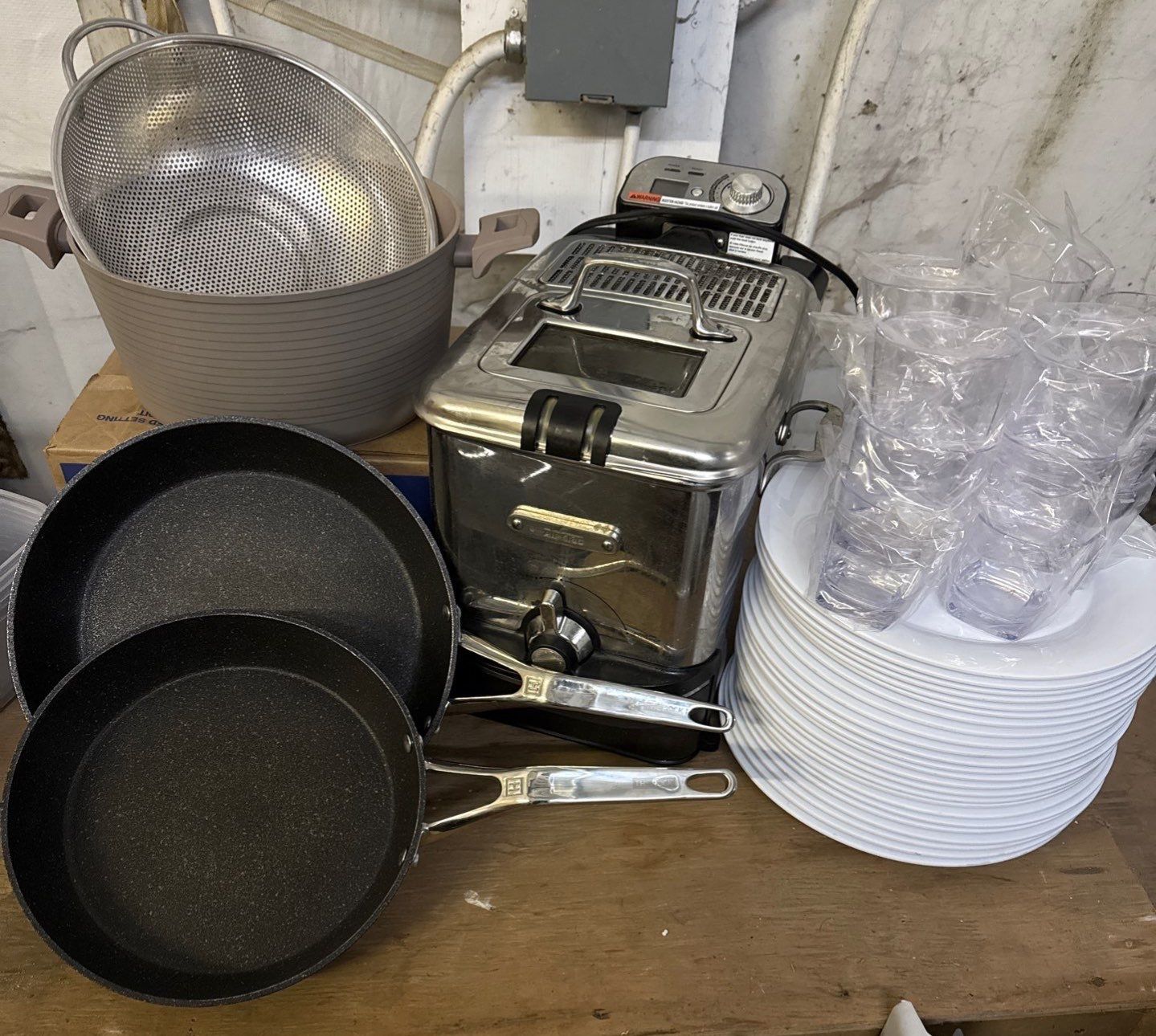 Collection Of Assorted Kitchen Items- Pans, Strainer, Deep Fryer, Cups, Plates & More