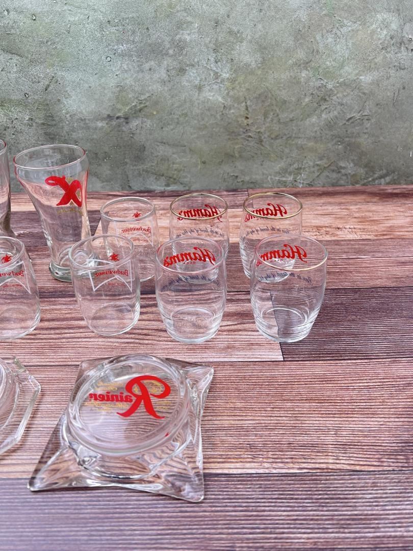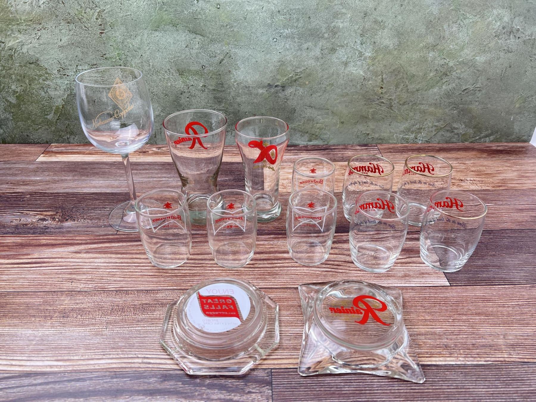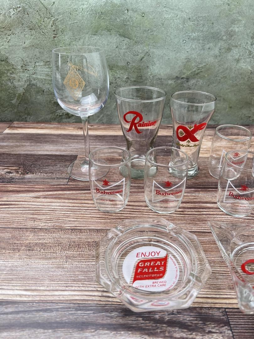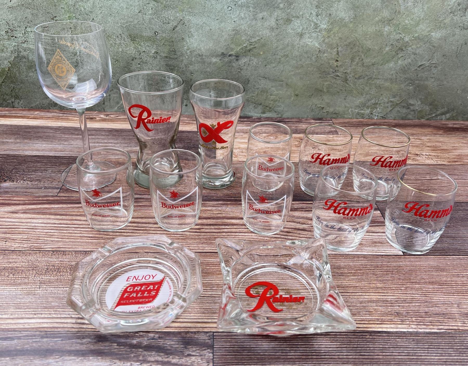 11 glasses & 2 ashtrays. Rainier, Hamm's, Budweiser, Great Falls Select, Lucky Lager.
