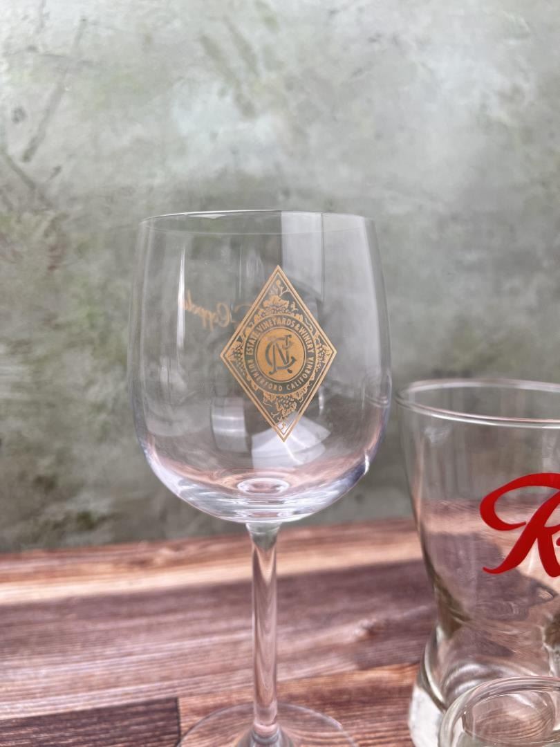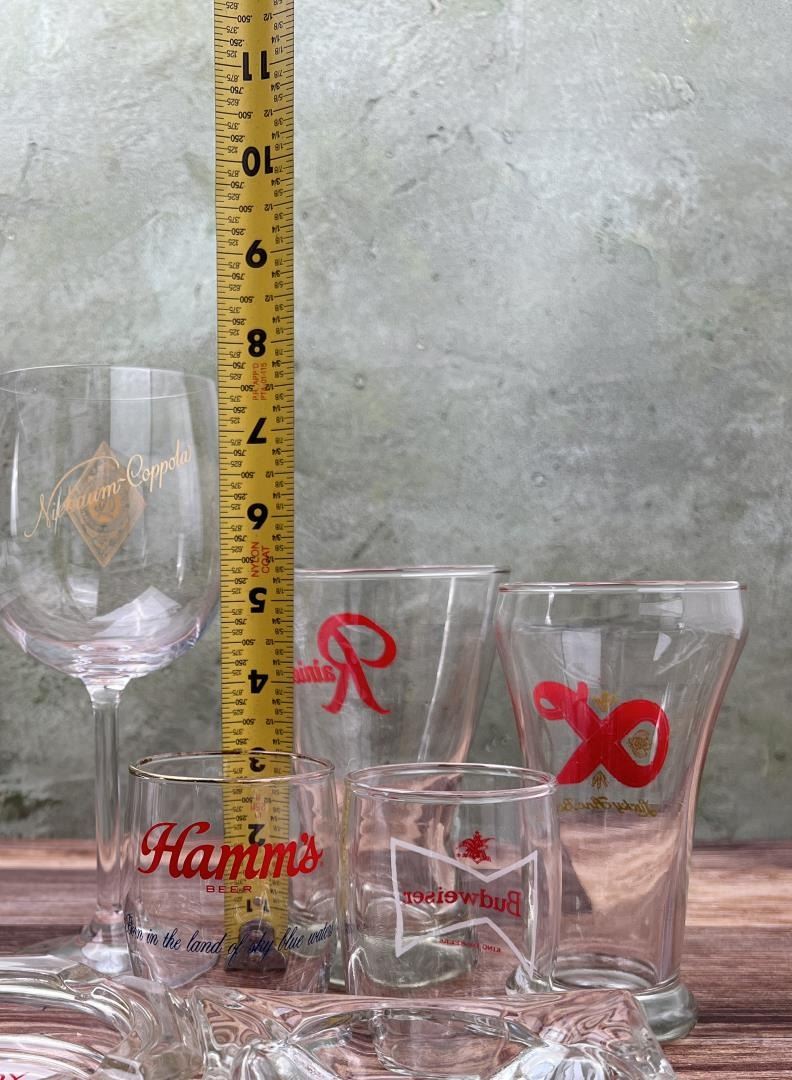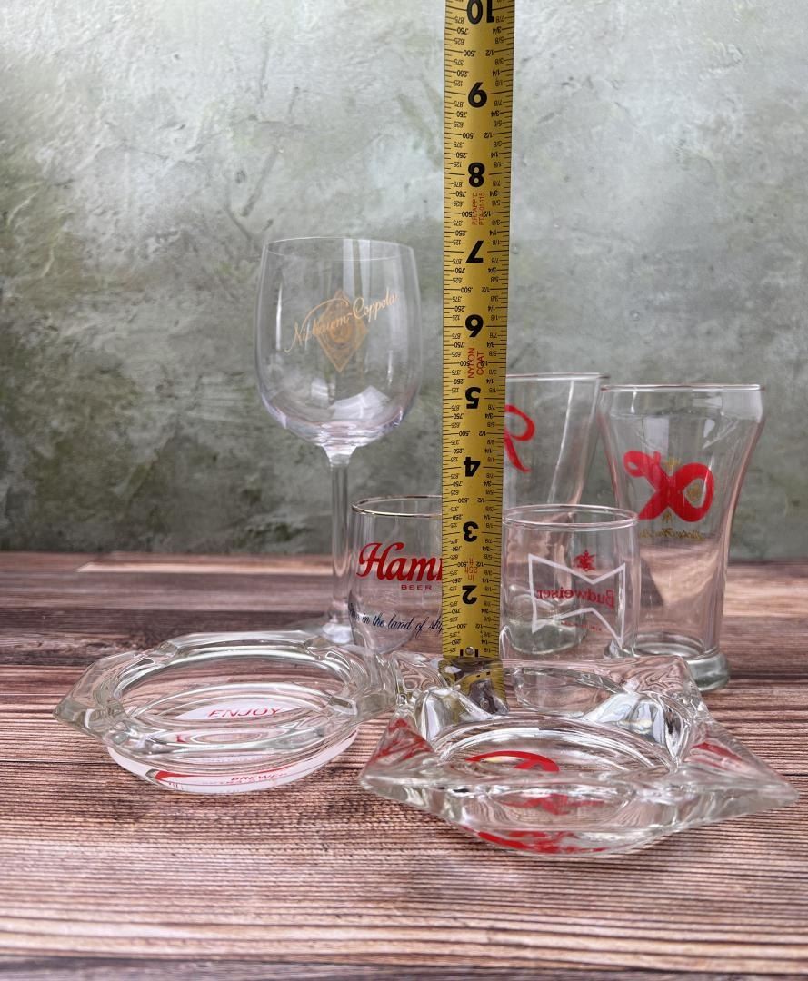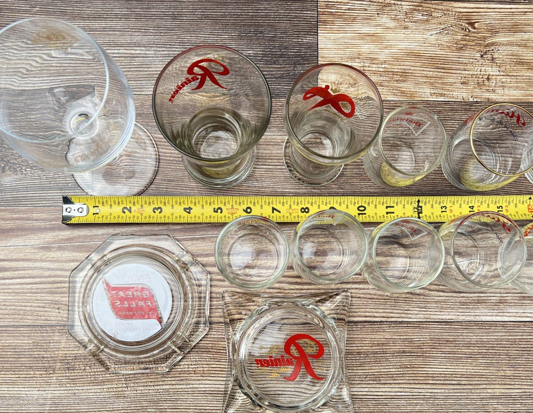 11 glasses & 2 ashtrays. Rainier, Hamm's, Budweiser, Great Falls Select, Lucky Lager.