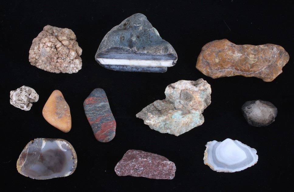 In this lot is a collection of crystals, stones, and cut and polished rocks. The first rock looks like petrified wood with Quartz and Chromium. The next rock looks like a smoky quartz crystal; the next looks like a raw quartz stone. The next stones are a naturally smoothed, dark stone with red jasper-looking stripes; a gold, yellow smooth stone; a white stone; a yellow, large, smoother stone; and a red granite-looking stone. Also, in this lot are three cut and polished stones; these stones could include a diamond in the rough, as their type and origin is unknown.
