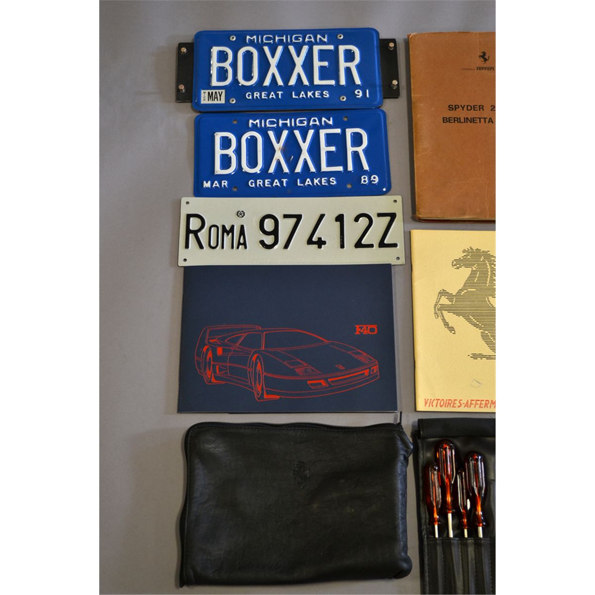 To include two Ferrari tool-kits in leather and vinyl pouches, a Ferrari spyder and Berlinetta spec book, a Ferrari F-40 owners manual in leather case, three license plates including an Italian example, Ferrari horse badges, and other miscellaneous items. Private collection St. Claire Shores, MI