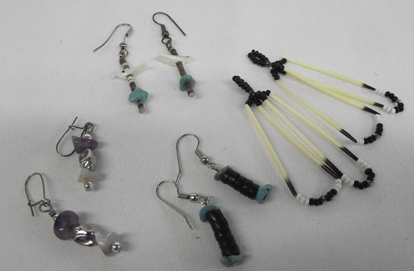 Collection Of Four Pair of Earrings, #1 Porcupine quill and bead earrings, #2 Heishi turquoise and bird fetish earrings. #3 Turquoise nugget and shell heishi earrings. #4 Amethyst and bead earrings. All are fish-hook style for pierced ears, the quill earrings are missing the findings. Largest measures 2 1/2''.
