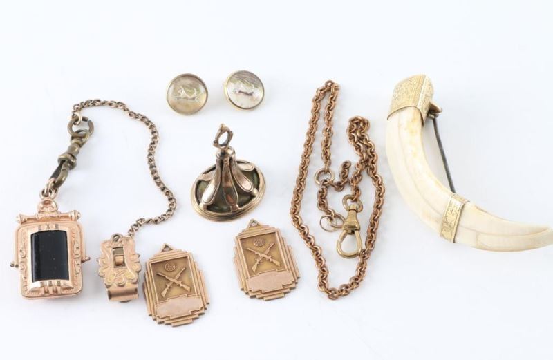 Including a Nautical themed watch fob on chain, wax stamp with L monogram. Two glass buttons with dogs Two 1949 dated with medallions with crossed rifles. also includes a Boar pin.