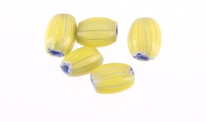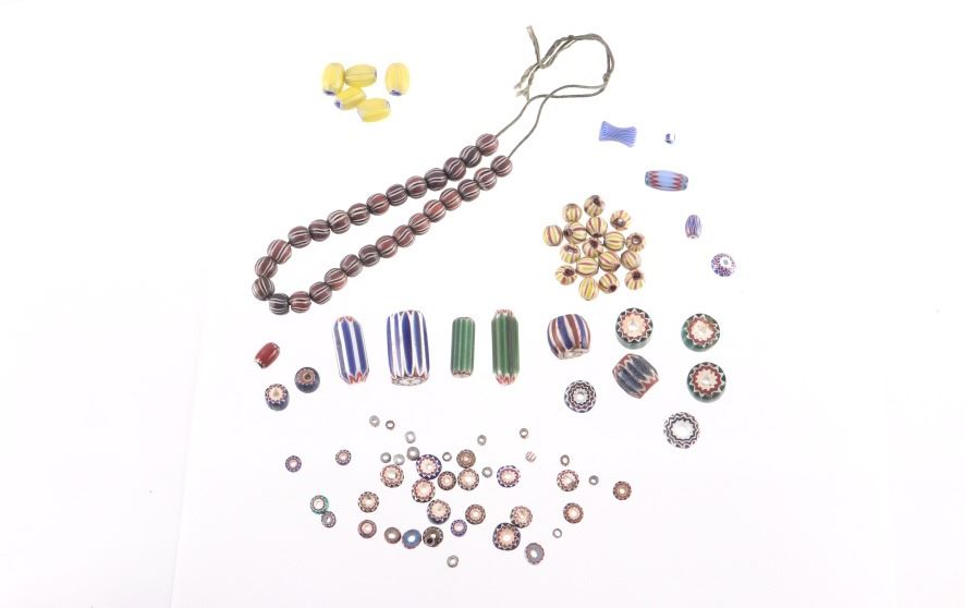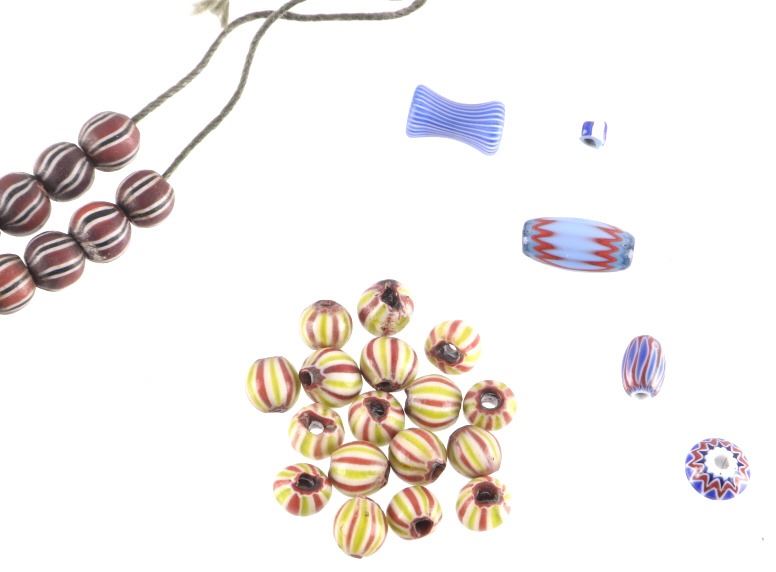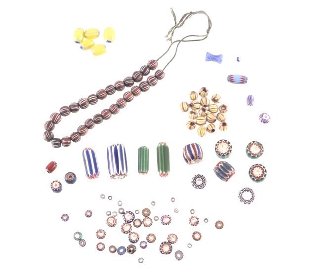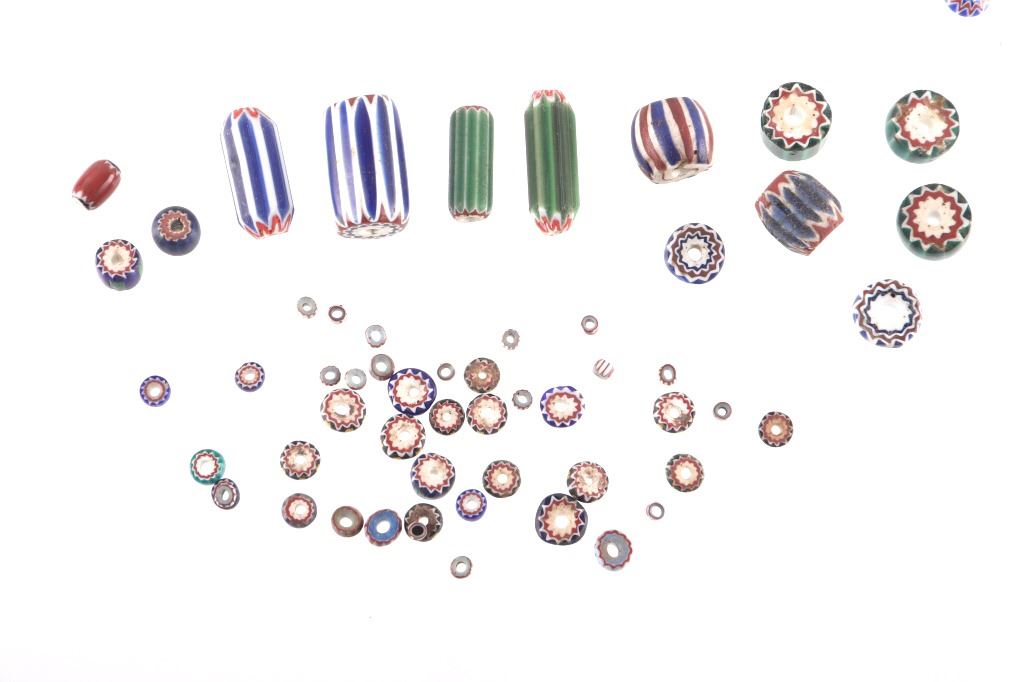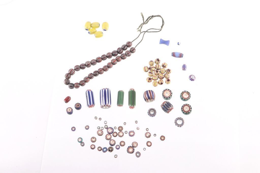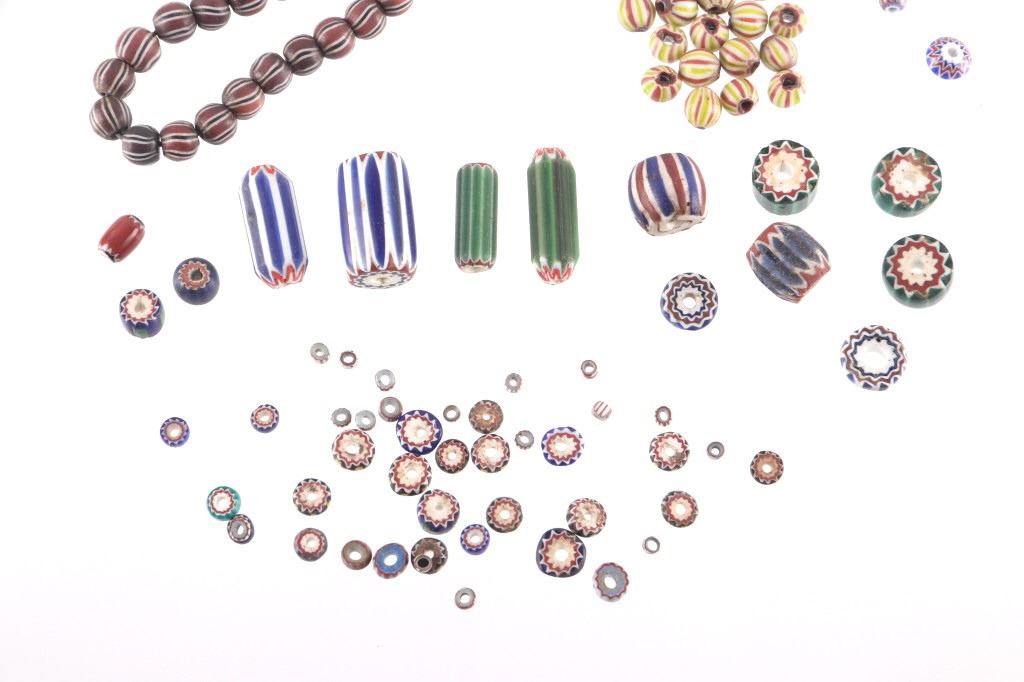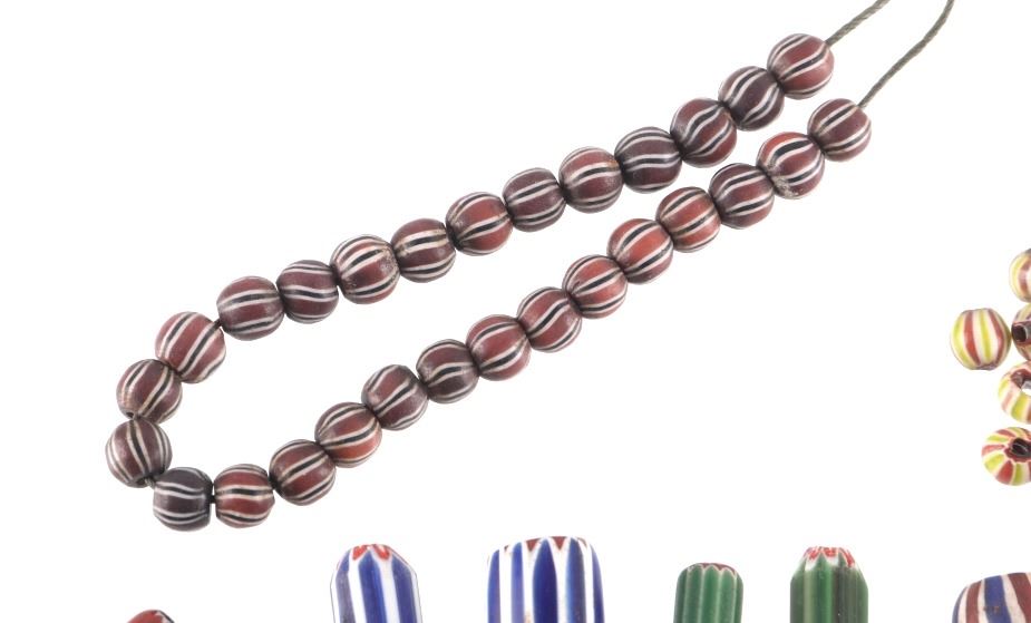 Offered in this lot is a collection of gooseberry and chevron trade beads. There are fifty nine chevron trade beads. The chevron beads range in size from 1" X 1/2" down to 1/8" X 1/8"; most are smaller beads. Next are two different beads; the first is a blue and white "pinched" bead. This bead measures 1/2" X 1/4". The next bead is a small 1/8" X 1/8" light blue core, white, blue striped bead. Next is a group of five blue heart/core, white, and yellow gooseberry beads. These beads measure an average of 1/2" X 5/8". The next group of beads is seventeen red heart/core small beads with light green, white, and red stripes. These beads are 1/4" X 1/4". The last group of beads is twenty eight black heart/core beads with red outer layer and white and black stripes. These beads are 1/4" X 1/4". All of the beads in this lot are in good to very good condition.