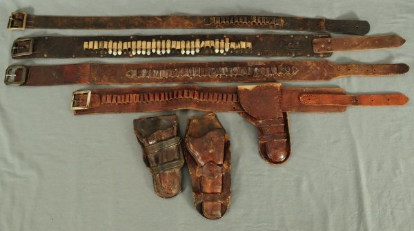 3 gun belts, 2 holsters, and 1 gu belt with holster attached.