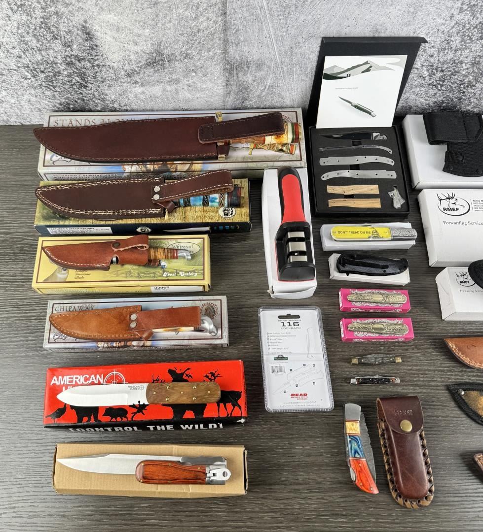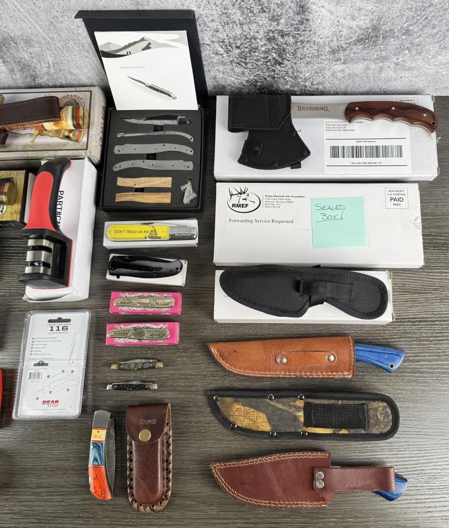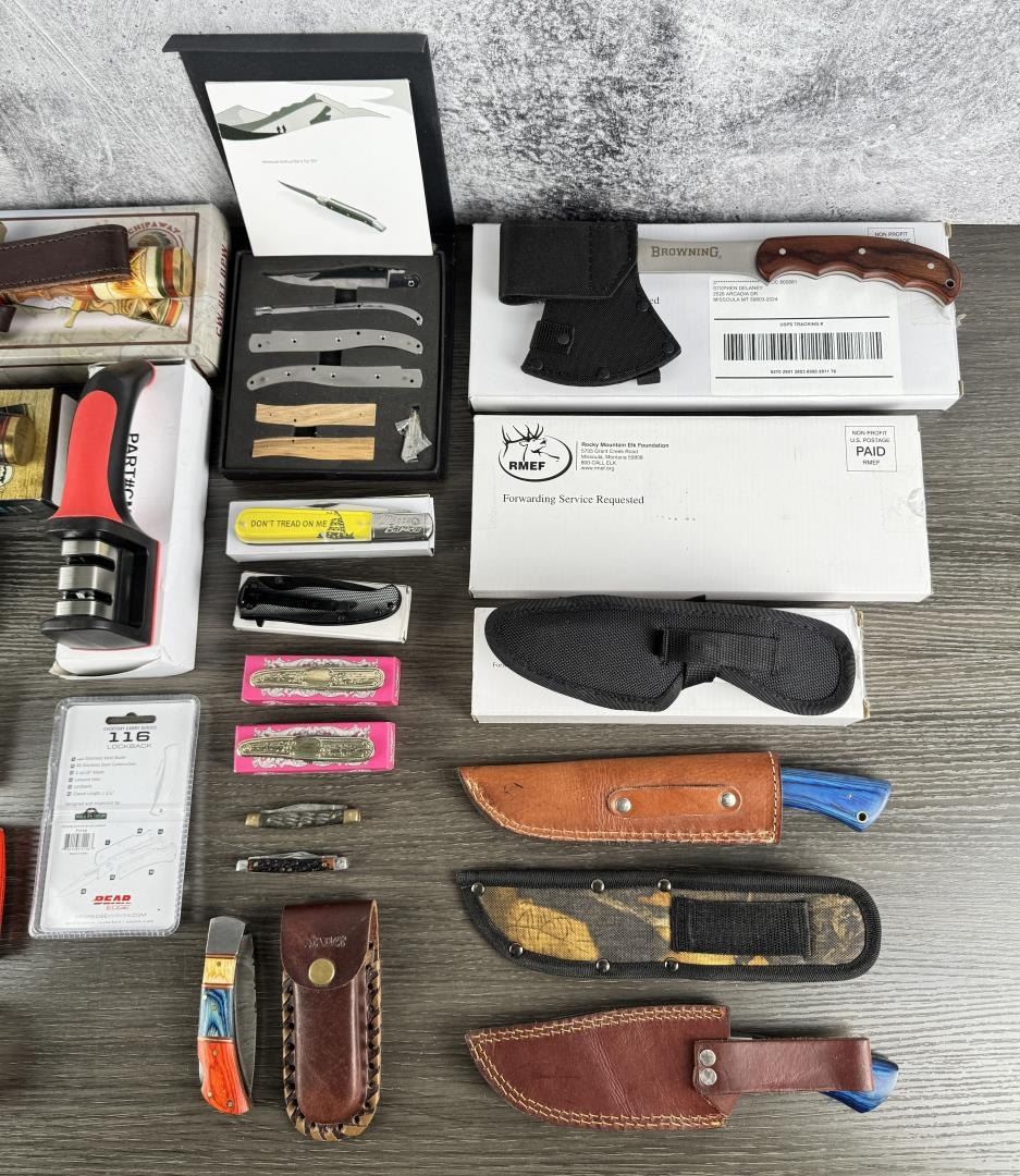 Nice diverse grouping including fixed blade, folders, pocket knives, sharpener, and a hatchet.