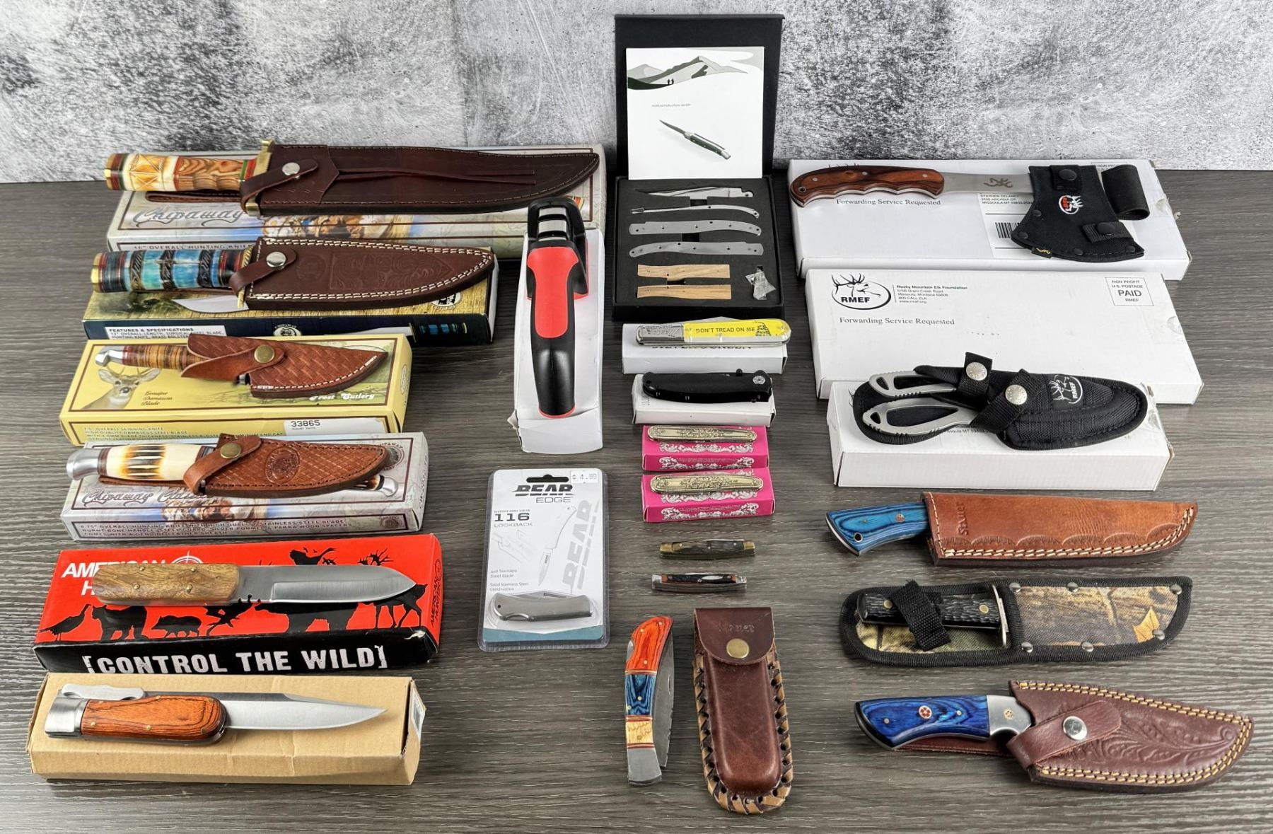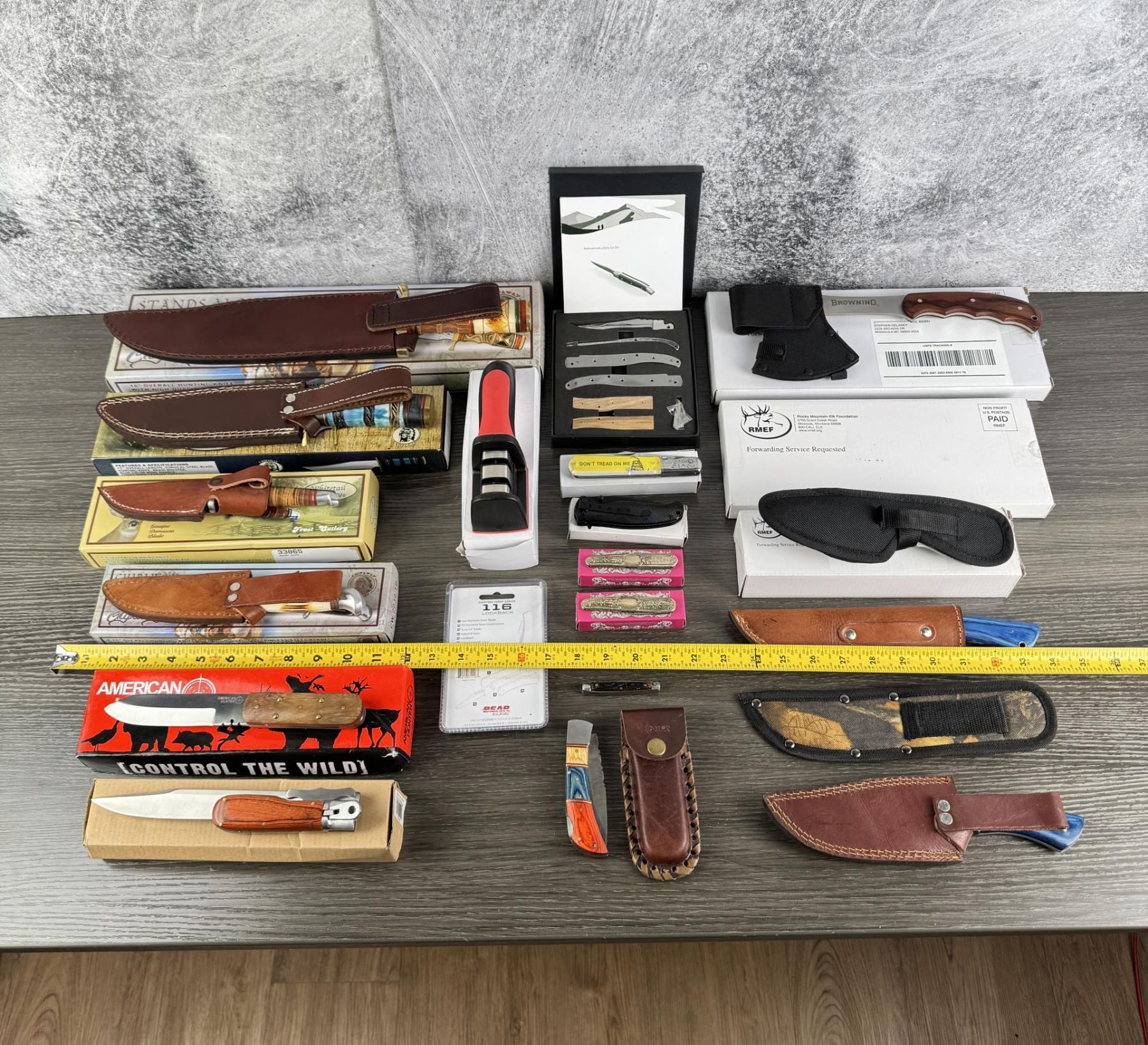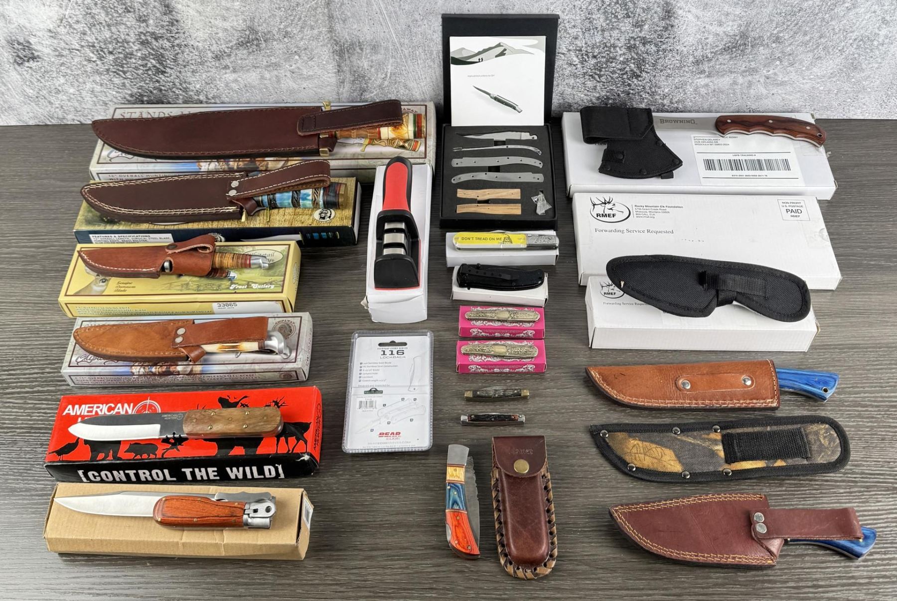 Nice diverse grouping including fixed blade, folders, pocket knives, sharpener, and a hatchet.