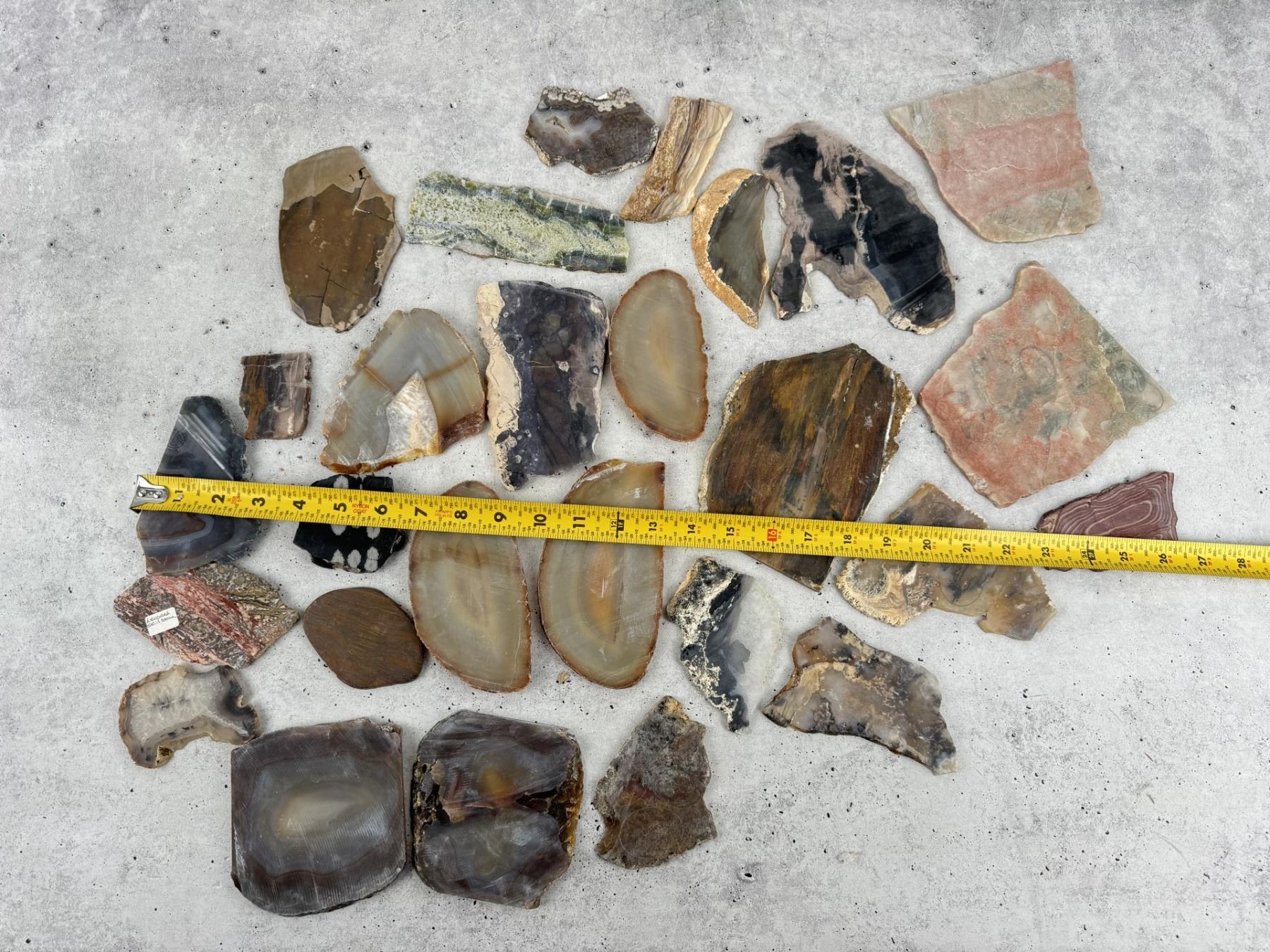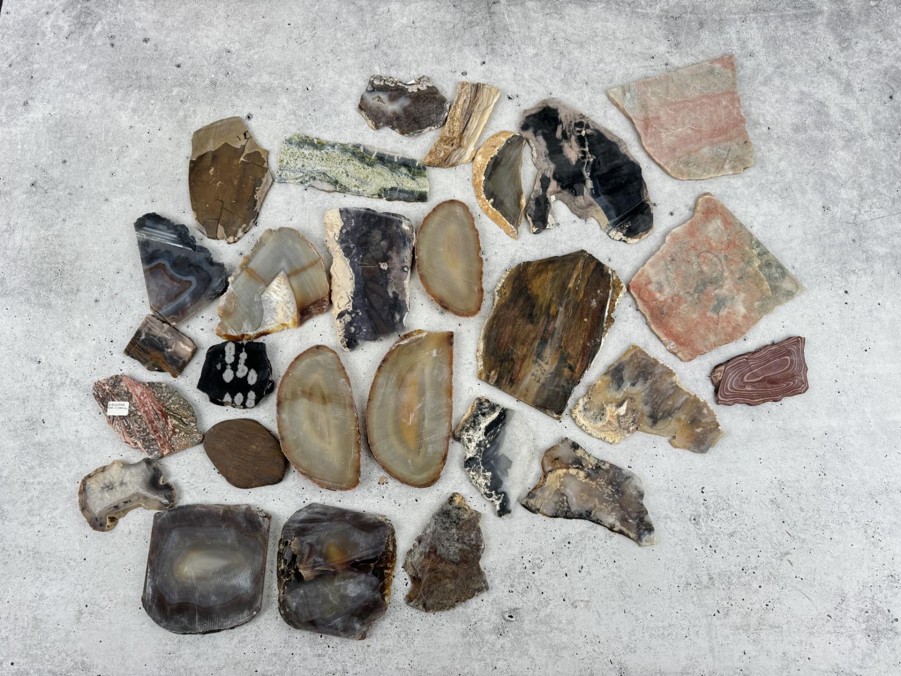 Includes agate, petrified wood, and snowflake obsidian. 6.2 lbs. Provenance: From the estate of Moosehead Gallery rock shop in Hamilton, Montana.